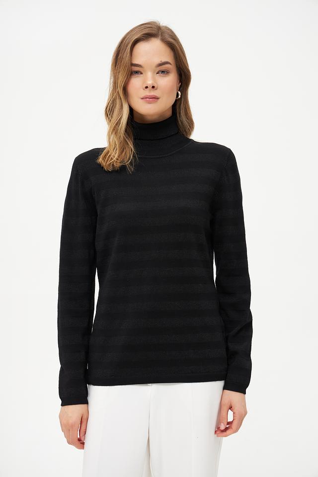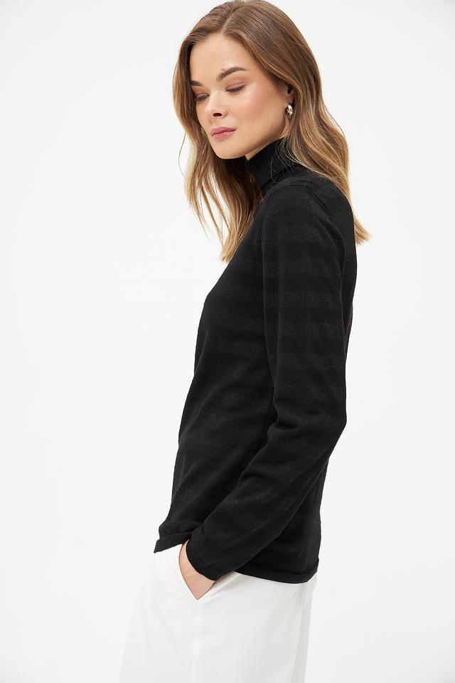 Чёрная водолазка от Broadway выполнена из мягкого трикотажа с деликатным узором. Состав включает вискозу, полиамид и металлизированную нить, что придает изделию особый блеск и комфорт. Состав: вискоза 65%, полиамид 29%, метализ.нить 6%