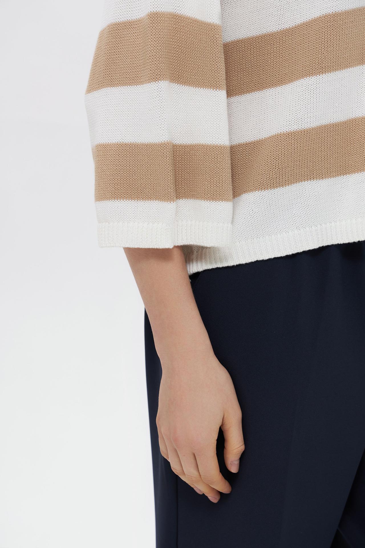 - Актуальный дизайн: Классический полосатый принт в сочетании белого и бежевого оттенков всегда остается в тренде. Укороченные рукава-реглан и свободный крой создают непринужденный, стильный силуэт.