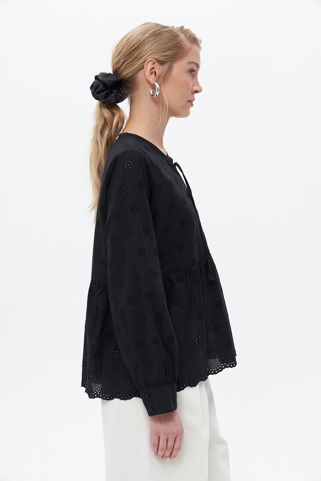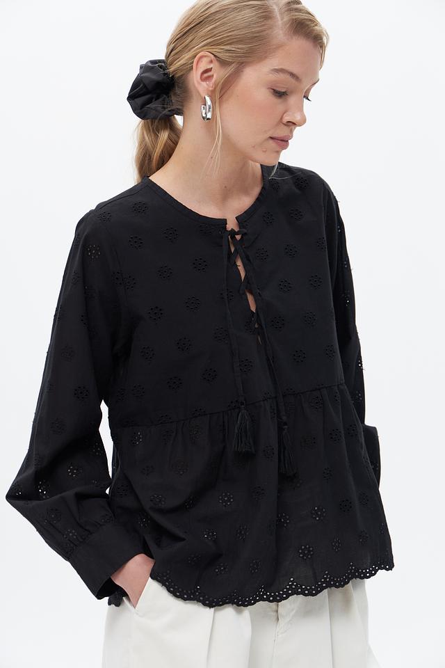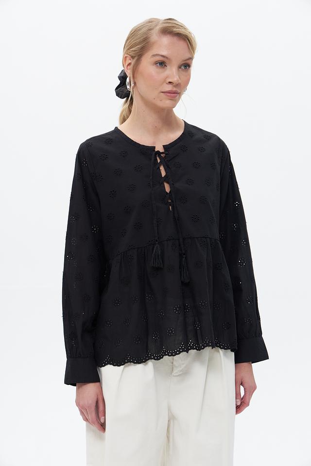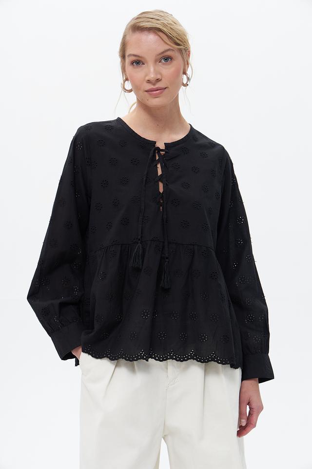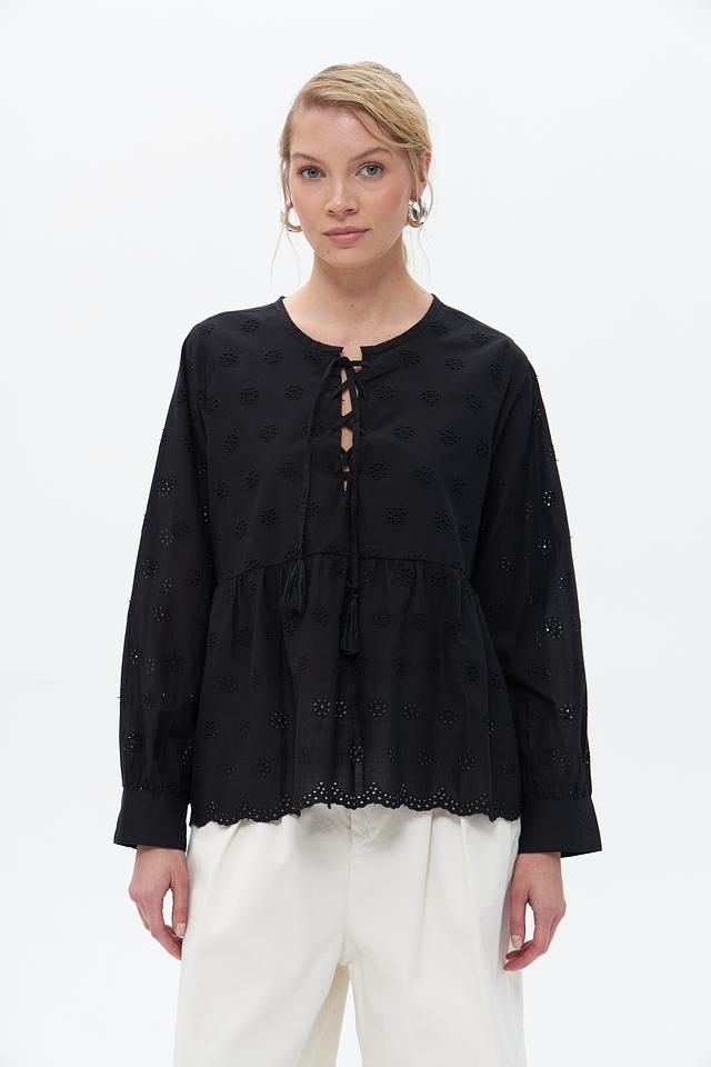 Чёрная блузка от Broadway выполнена из 100% хлопка и украшена объёмной вышивкой. Модель имеет свободный крой, рукава-фонарики и завязки с кистями на вырезе. Состав: хлопок 100%