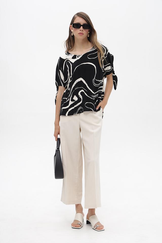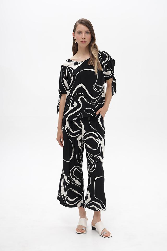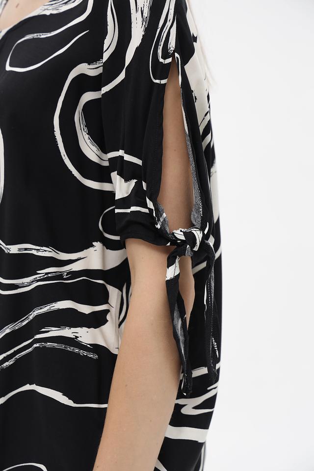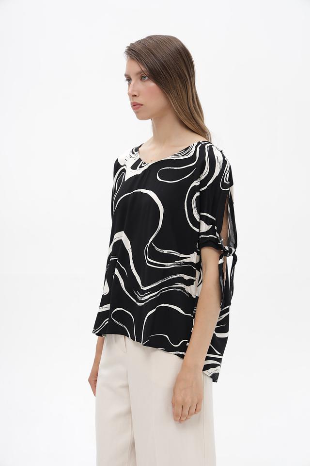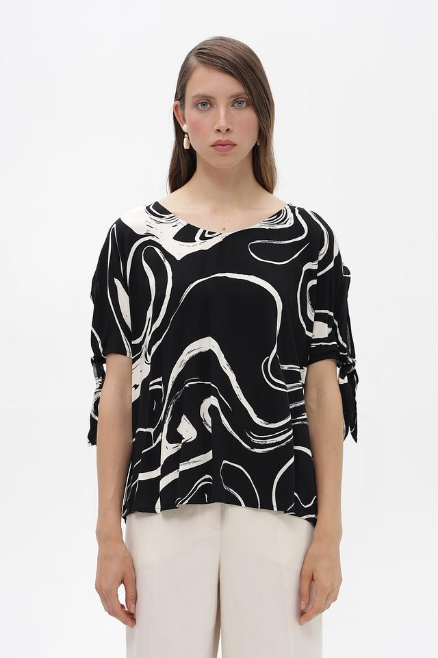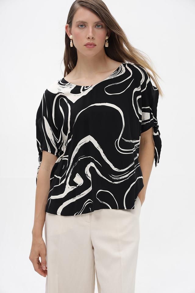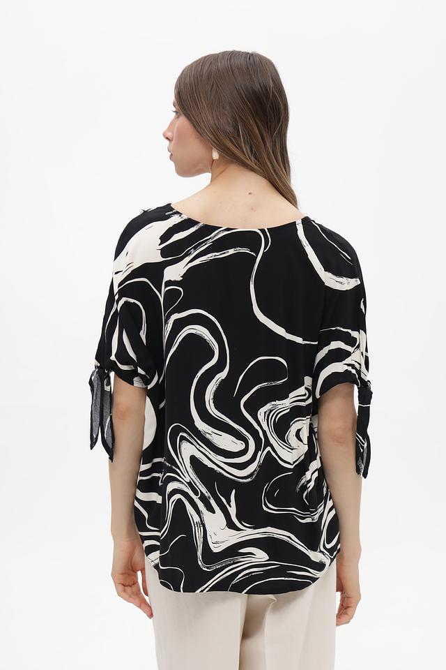 Элегантная блузка от бренда Broadway, выполненная в чёрно-белой гамме с эффектным абстрактным принтом. Модель с коротким рукавом и округлым вырезом горловины.