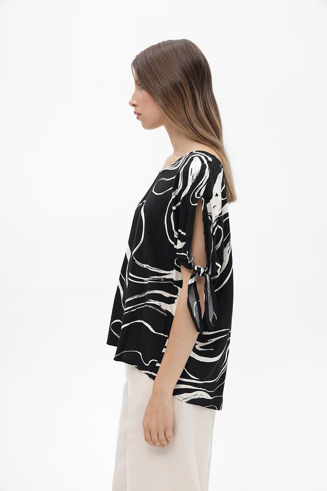 Оригинальный дизайн дополнен разрезами на рукавах, фиксирующимися тонкими завязками, что придает блузке воздушность и лёгкость. Благодаря свободному крою, блузка удобно сидит по фигуре и не сковывает движений.