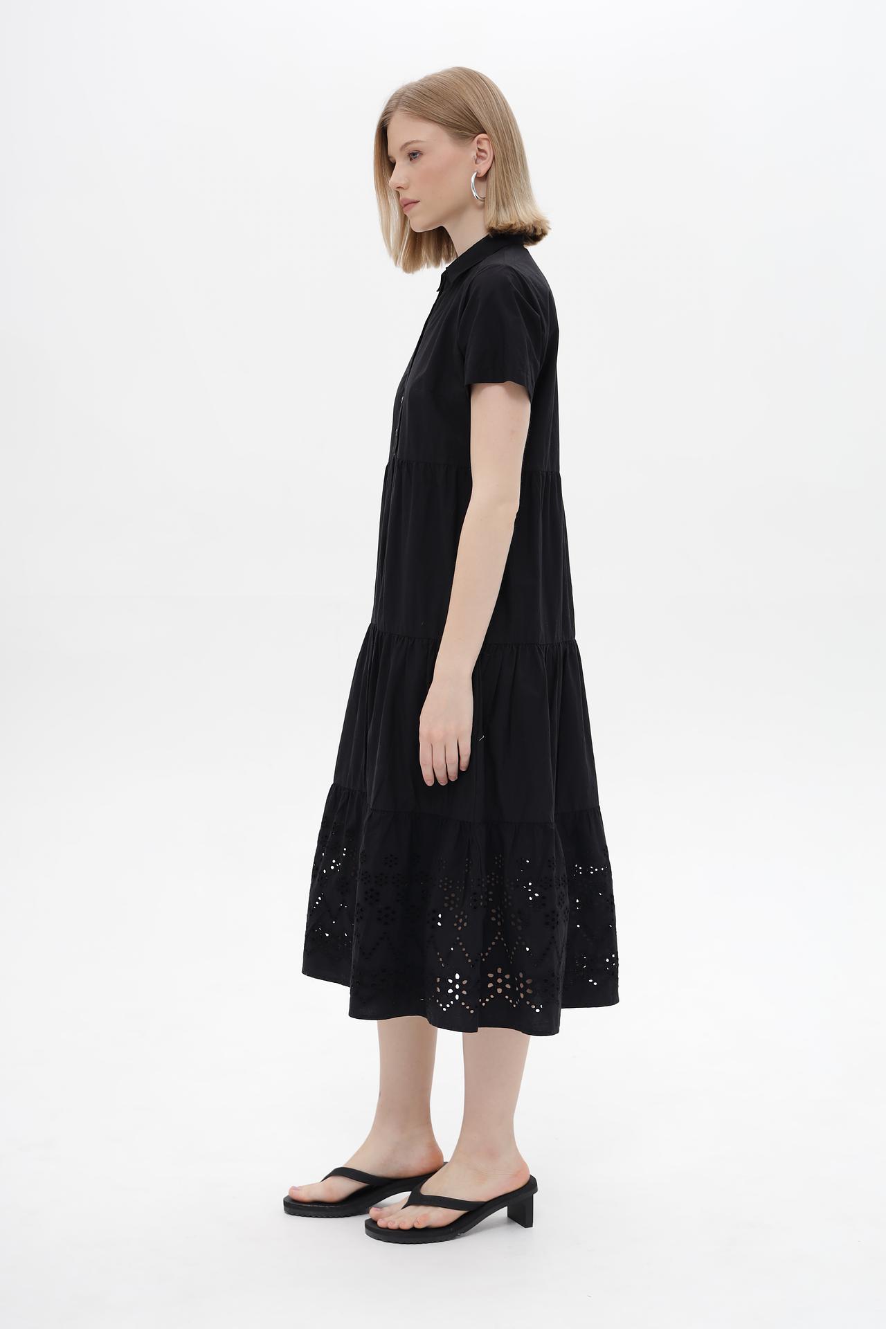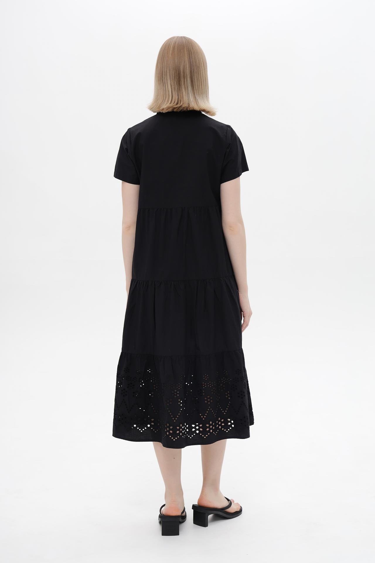 - Дизайн: Платье миди длины с коротким рукавом и воротником-стойкой. Многоярусная юбка с изысканной вышивкой по подолу придает модели особое очарование и легкость.