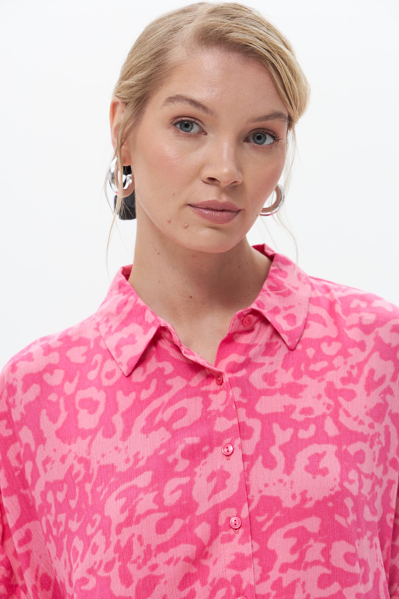 - Яркий дизайн. Оригинальный розовый узор придает блузе неповторимый вид.