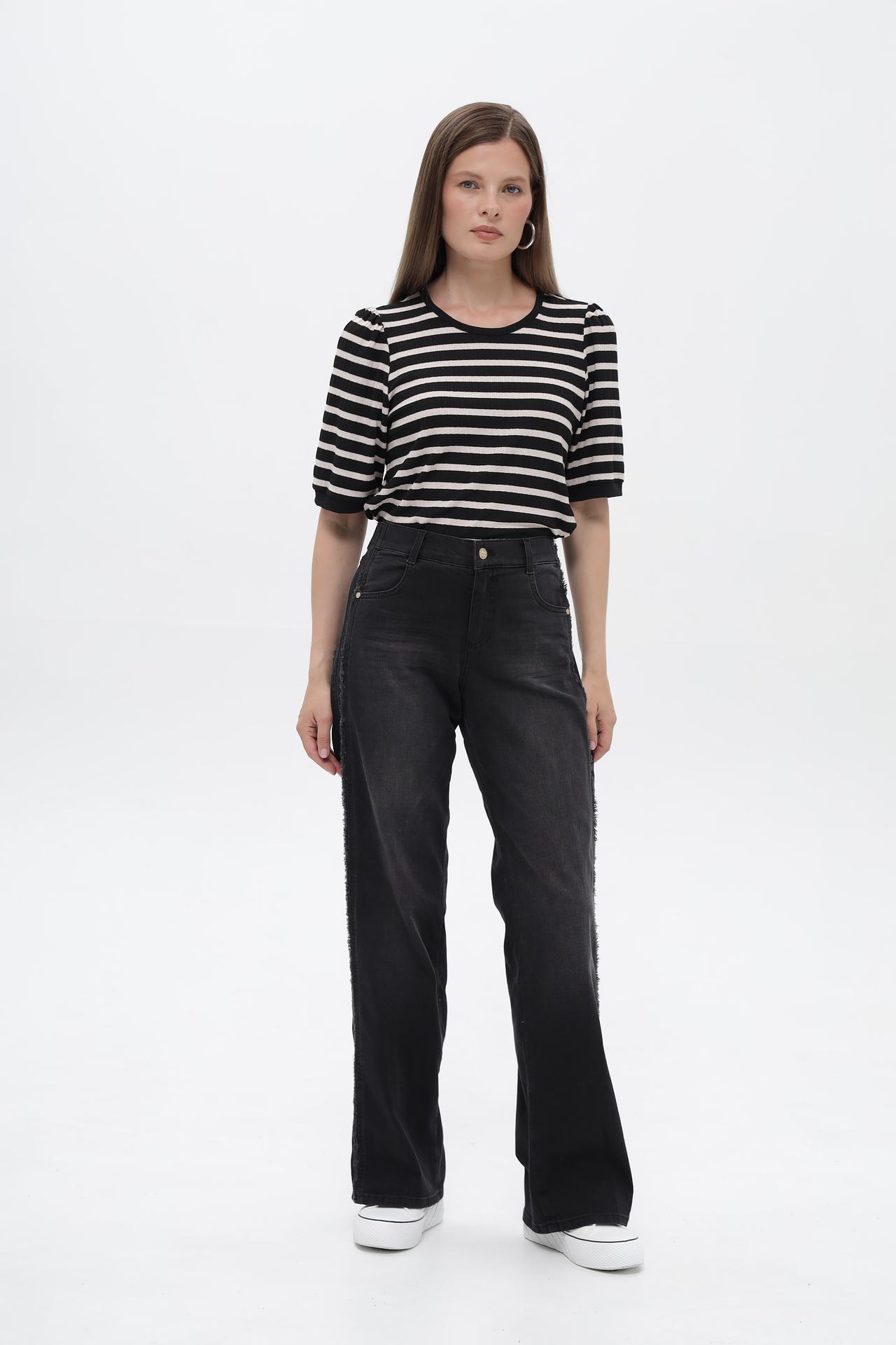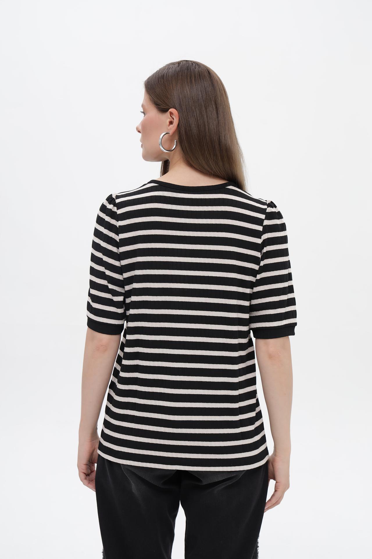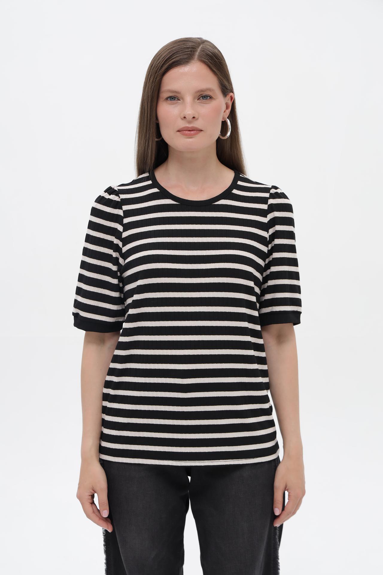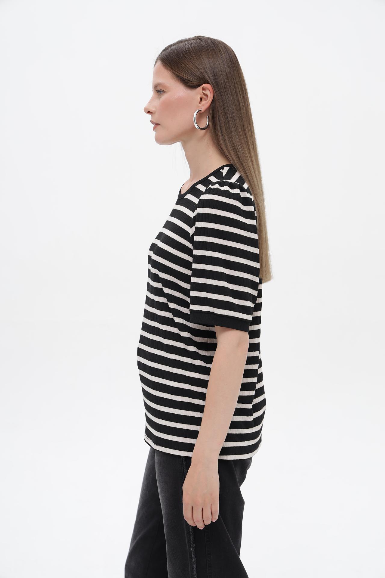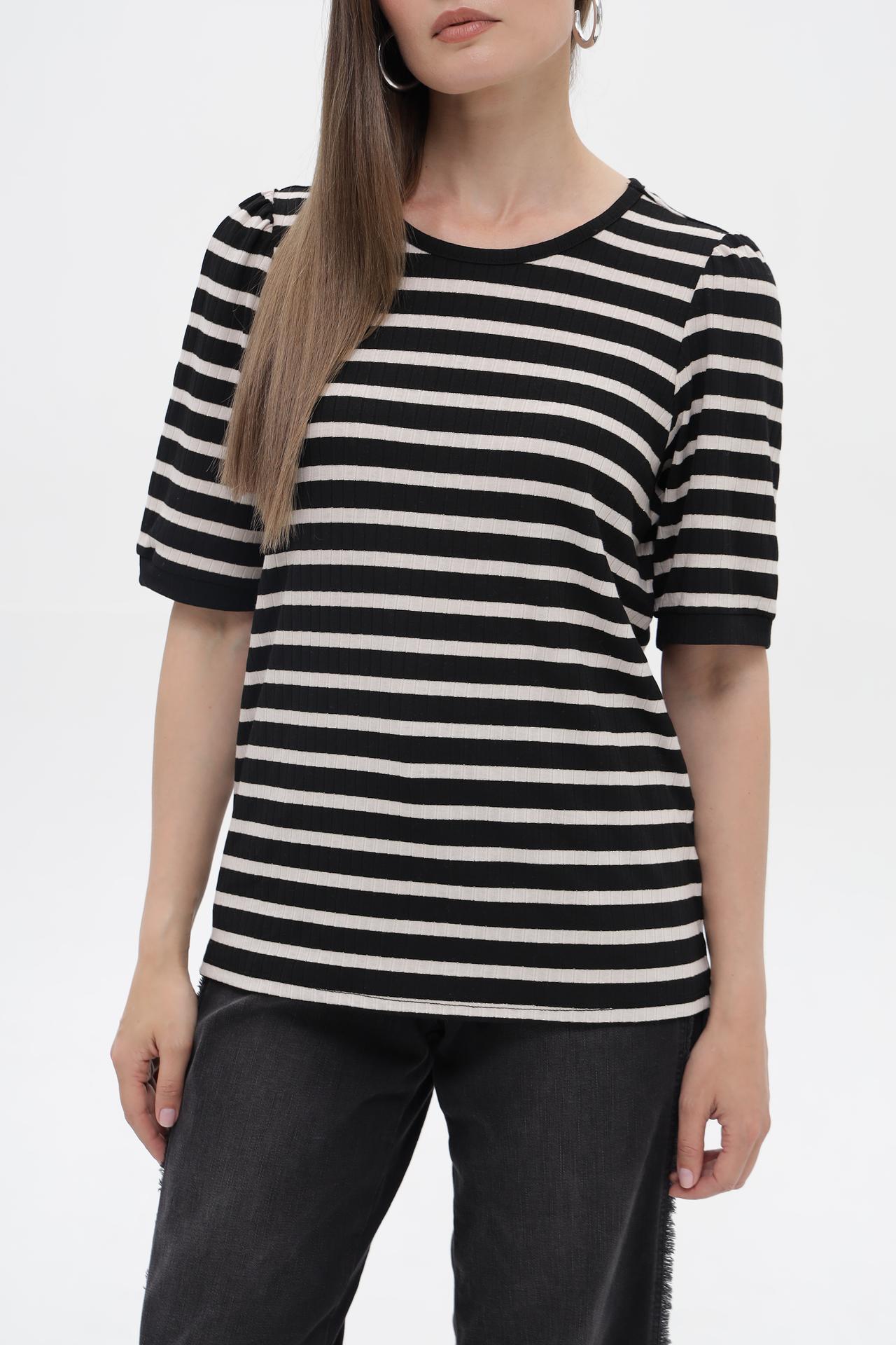 - Дизайн: Футболка с коротким рукавом в горизонтальную черно-белую полоску. Круглый вырез горловины и аккуратные сборки на плечах добавляют изделию изящества.