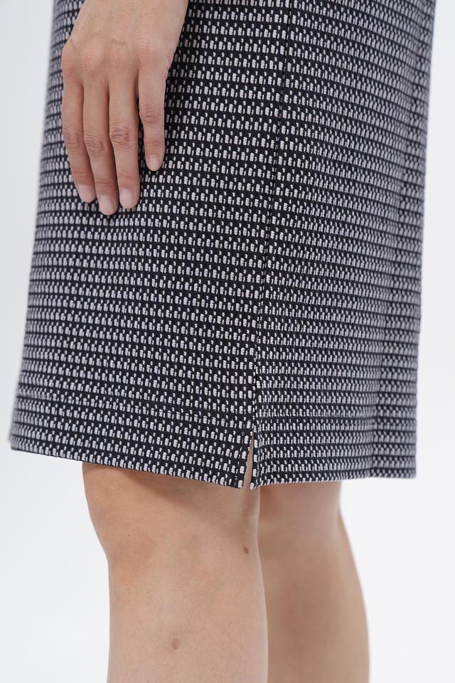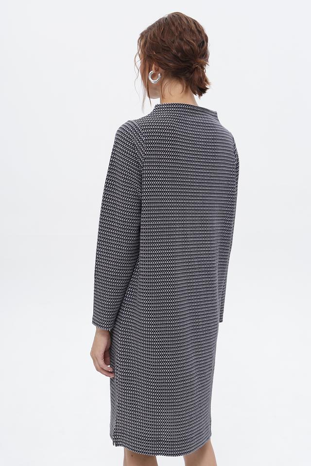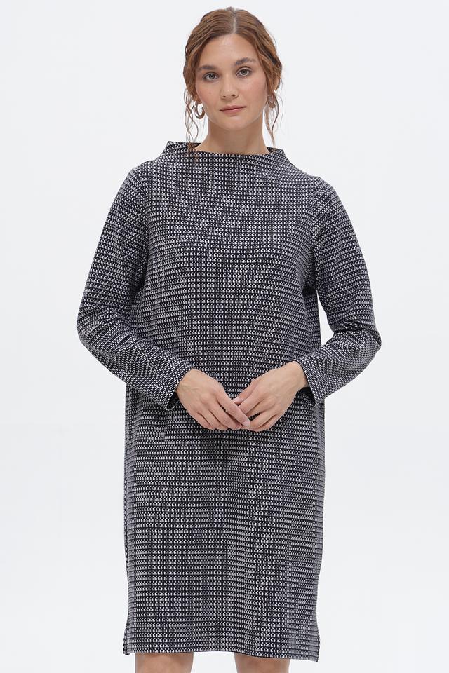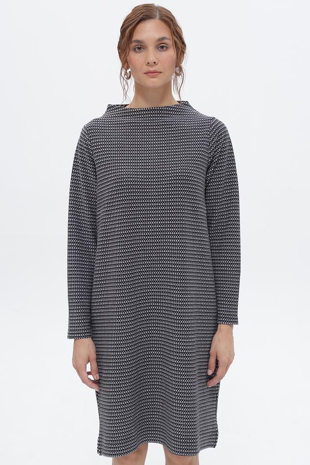 Платье от бренда Broadway выполнено из ткани с геометрическим принтом в серых тонах. Модель имеет прямой силуэт, длинные рукава и воротник-стойку.