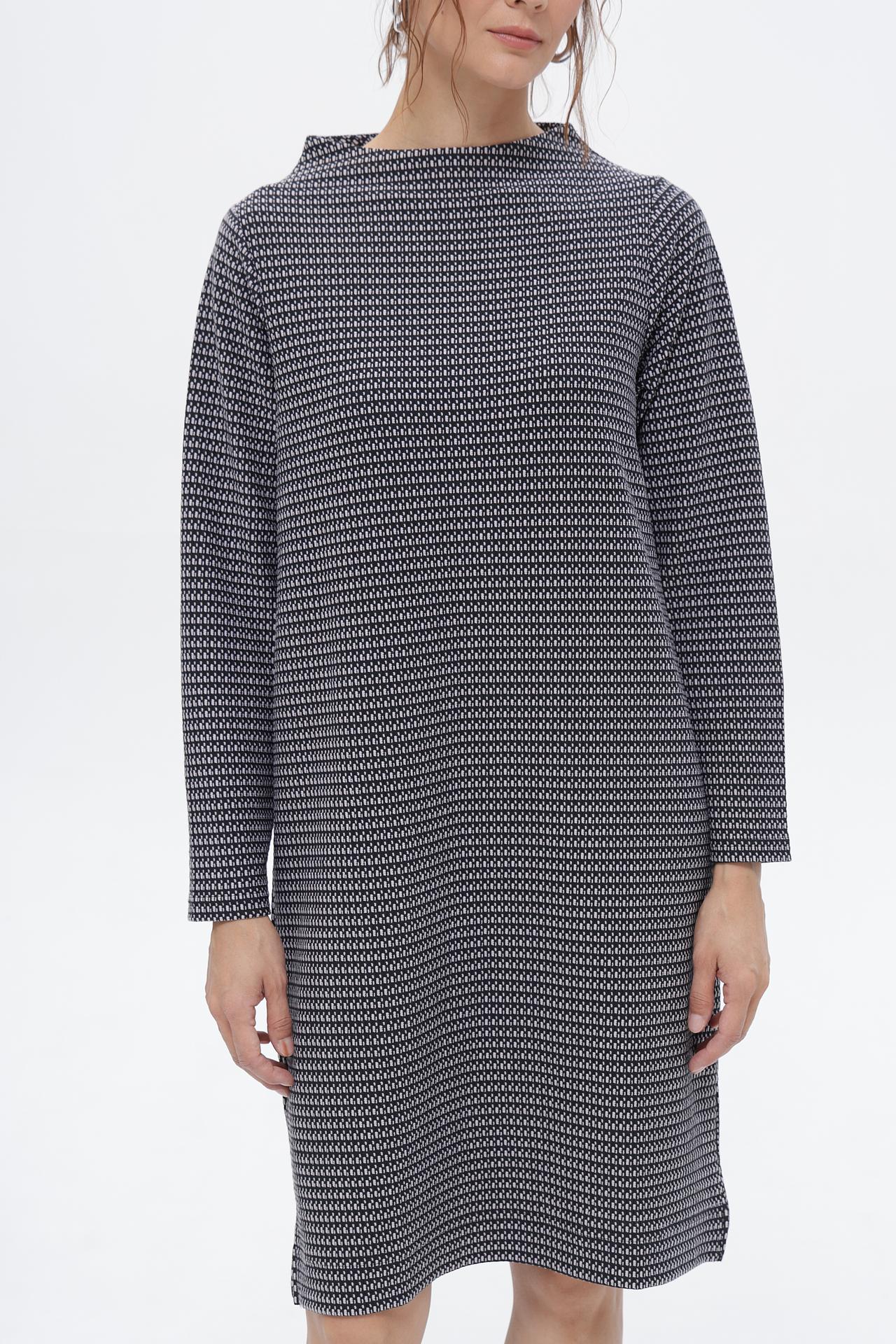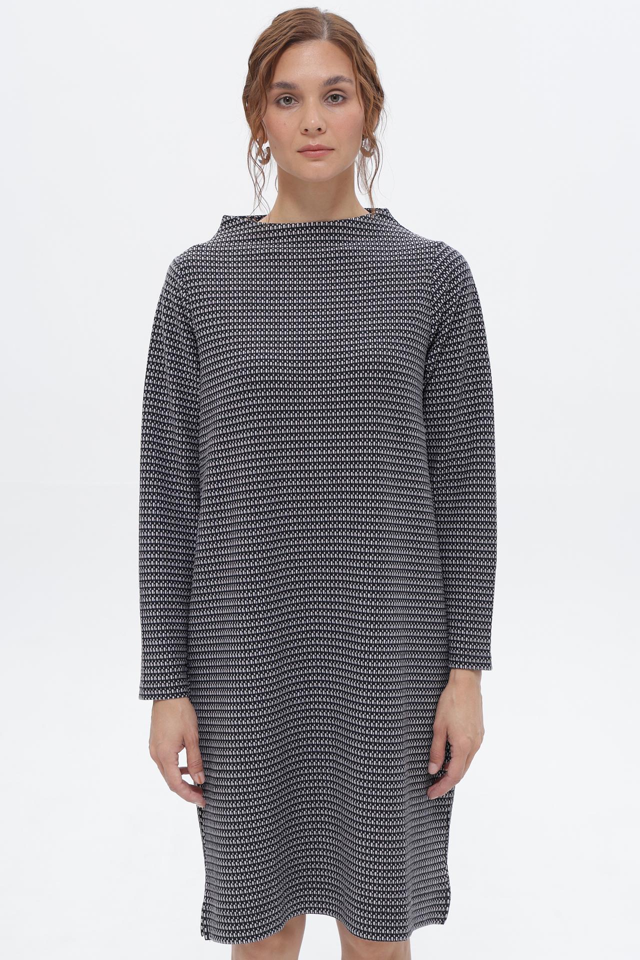 Элегантное платье Broadway — идеальный выбор для создания утонченного образа. Модель длиной до колена с длинными рукавами выполнена в приглушенных тонах, что делает её универсальной и подходящей для различных случаев. Необычный воротник-стойка придает платью изысканность и современный вид. Принт в виде мелкой геометрической вязи добавляет текстуры и глубины, делая эту модель особенной.