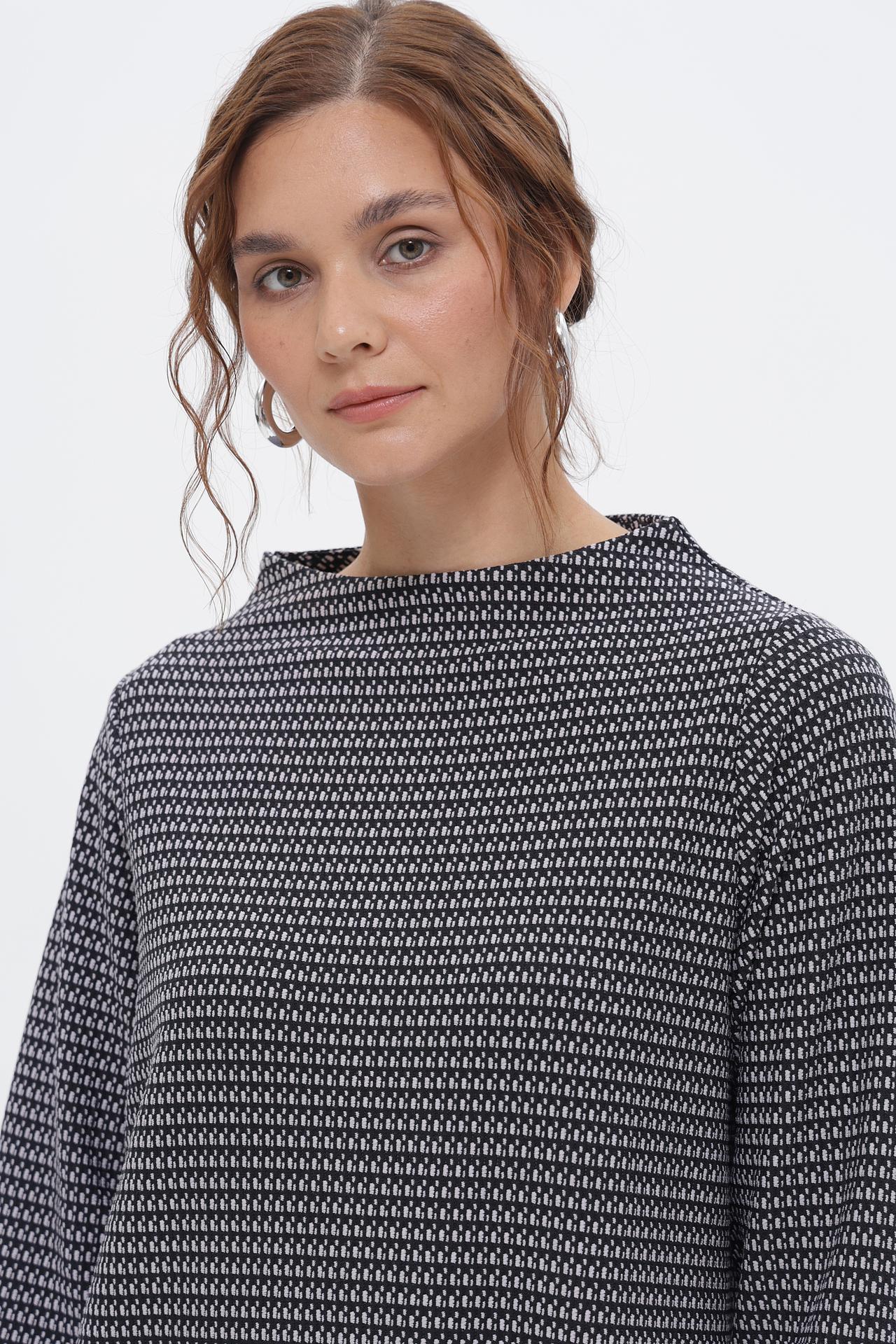- Дизайн: Воротник-стойка — трендовый элемент, который добавляет образу нотку строгости и шика. Мелкий геометрический узор выглядит стильно и ненавязчиво.