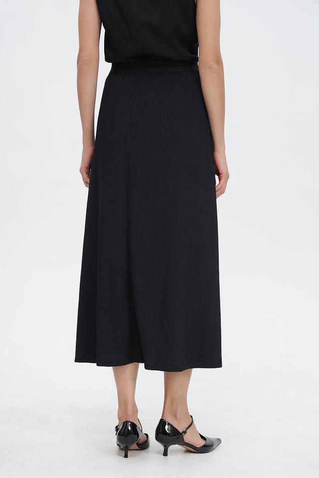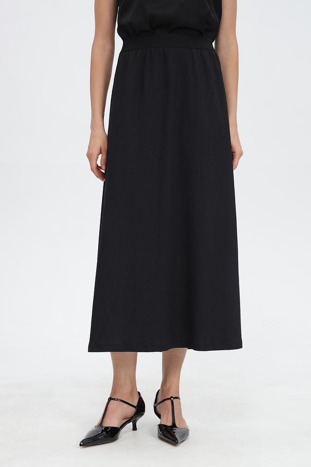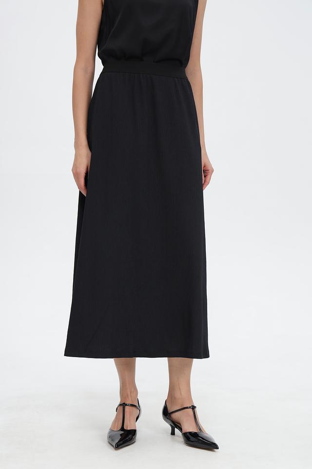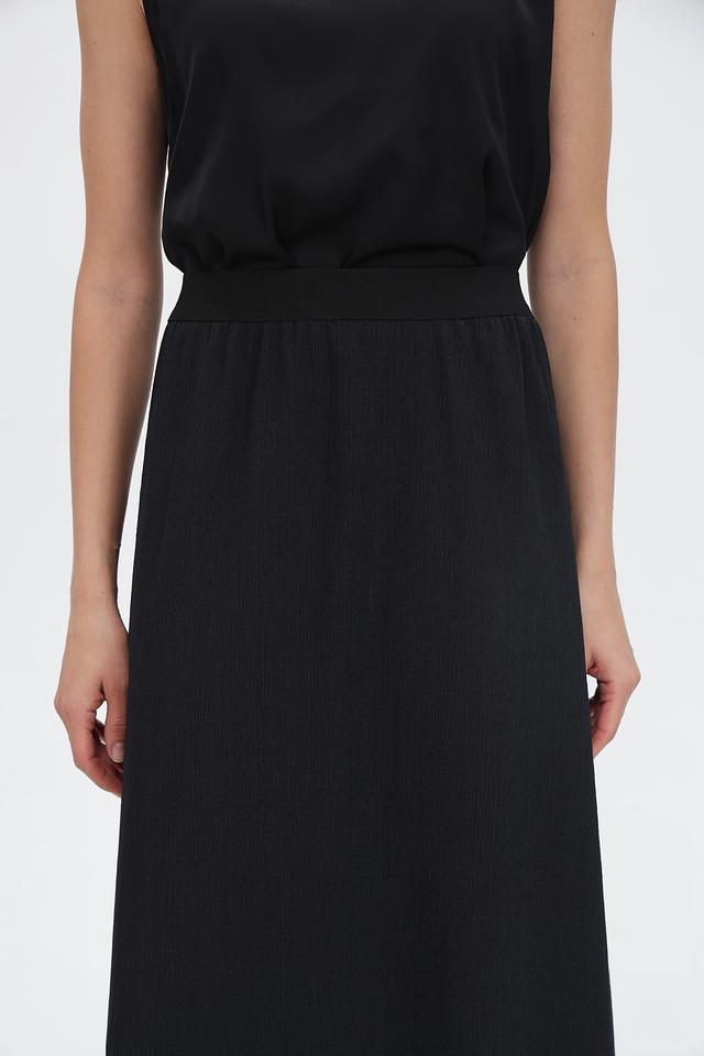 Юбка имеет длину миди и прямой силуэт, что делает ее универсальной для создания как повседневных, так и более формальных образов. Удобная эластичная талия обеспечивает комфортную посадку по фигуре.