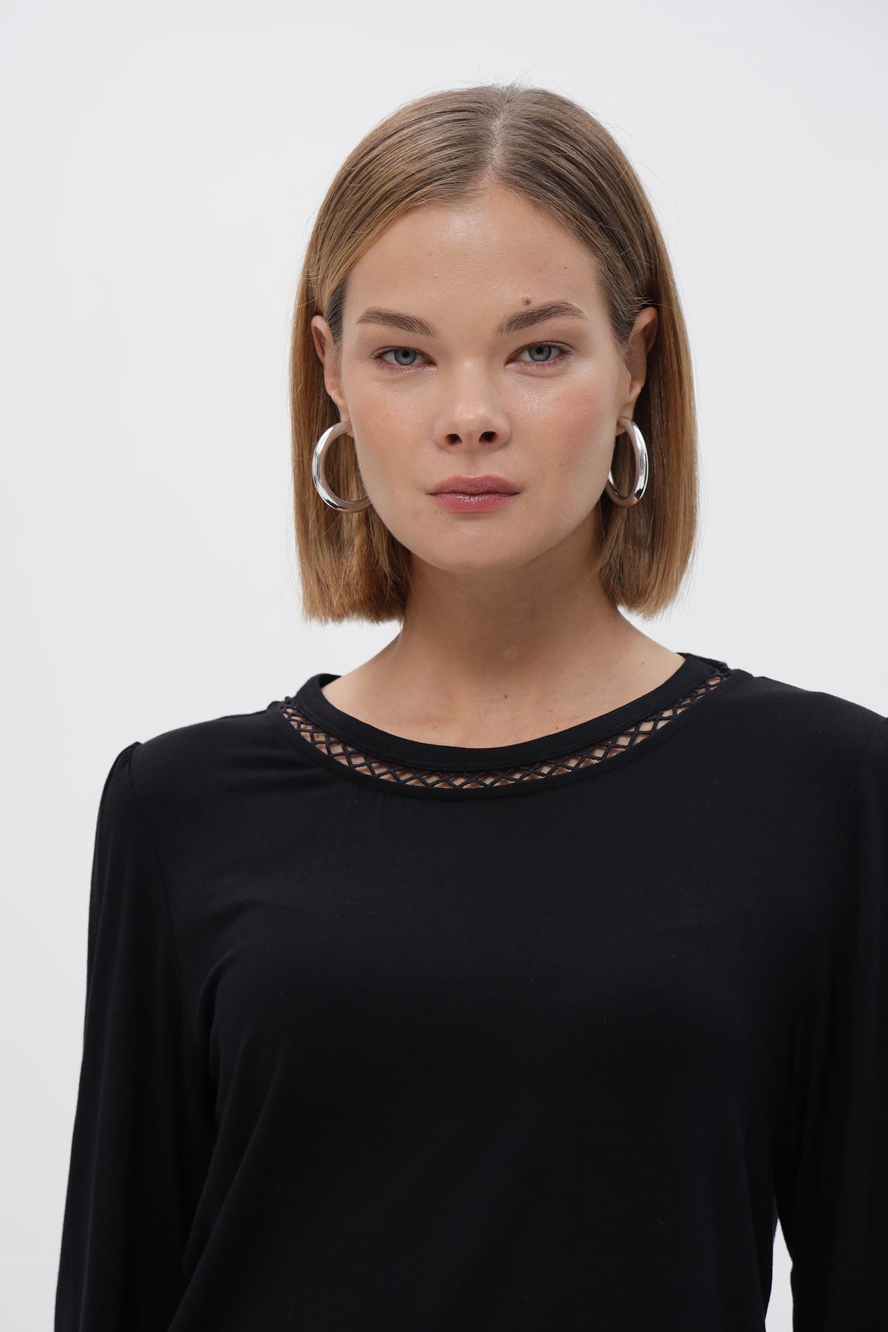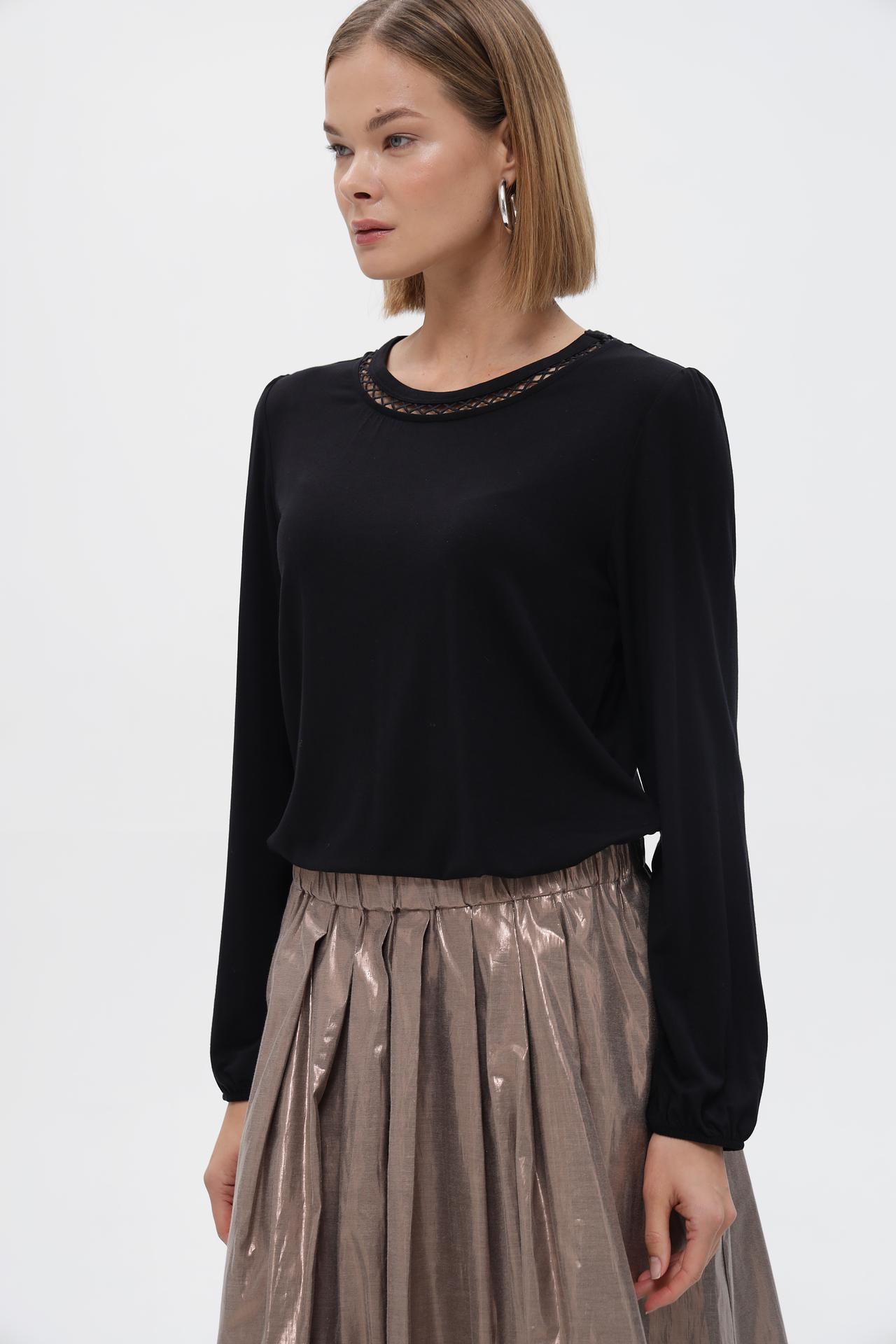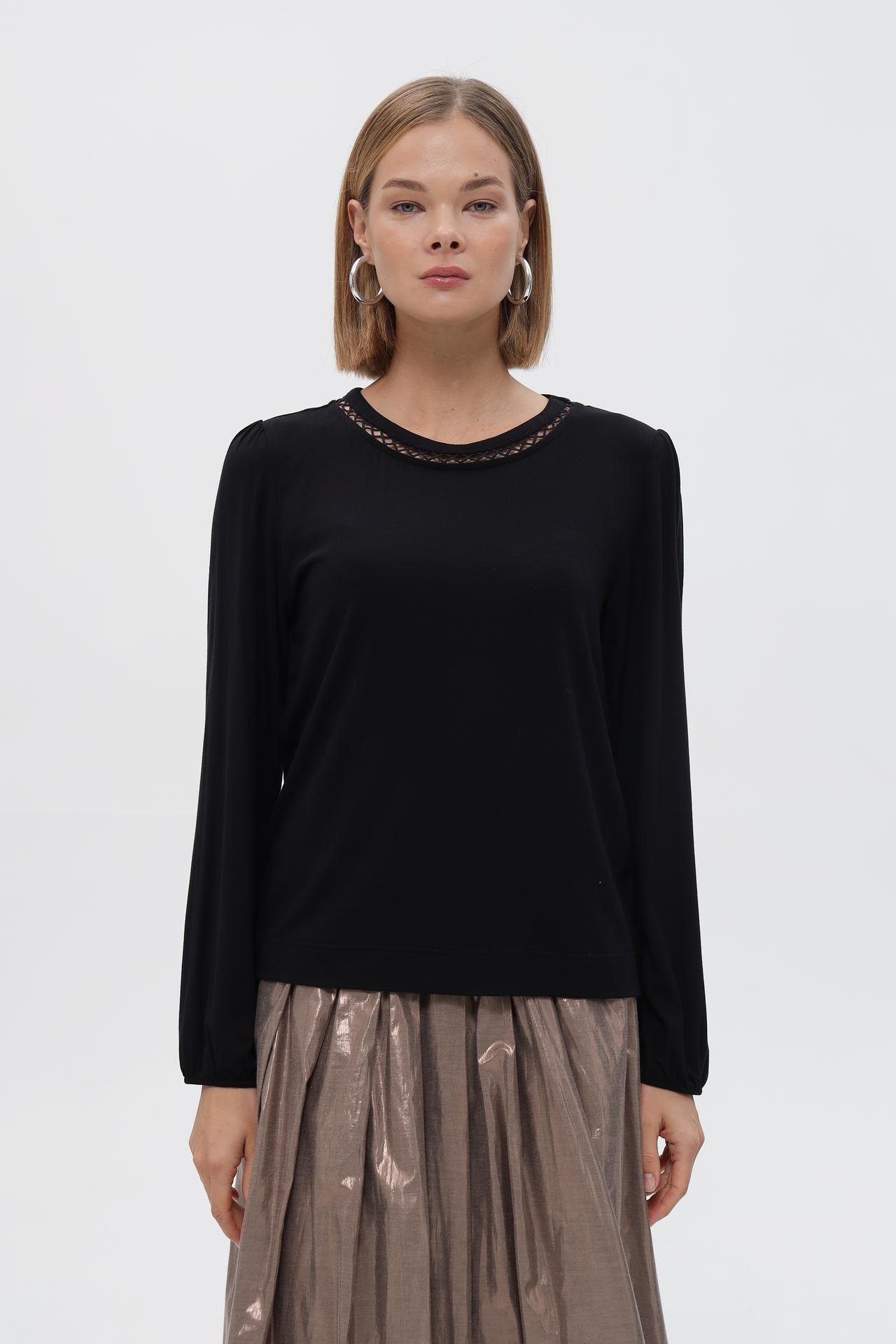 - Дизайн: Классический круглый вырез горловины украшен деликатной декоративной вставкой, выполненной в виде плетения. Длинные рукава с манжетами добавляют образу элегантности.