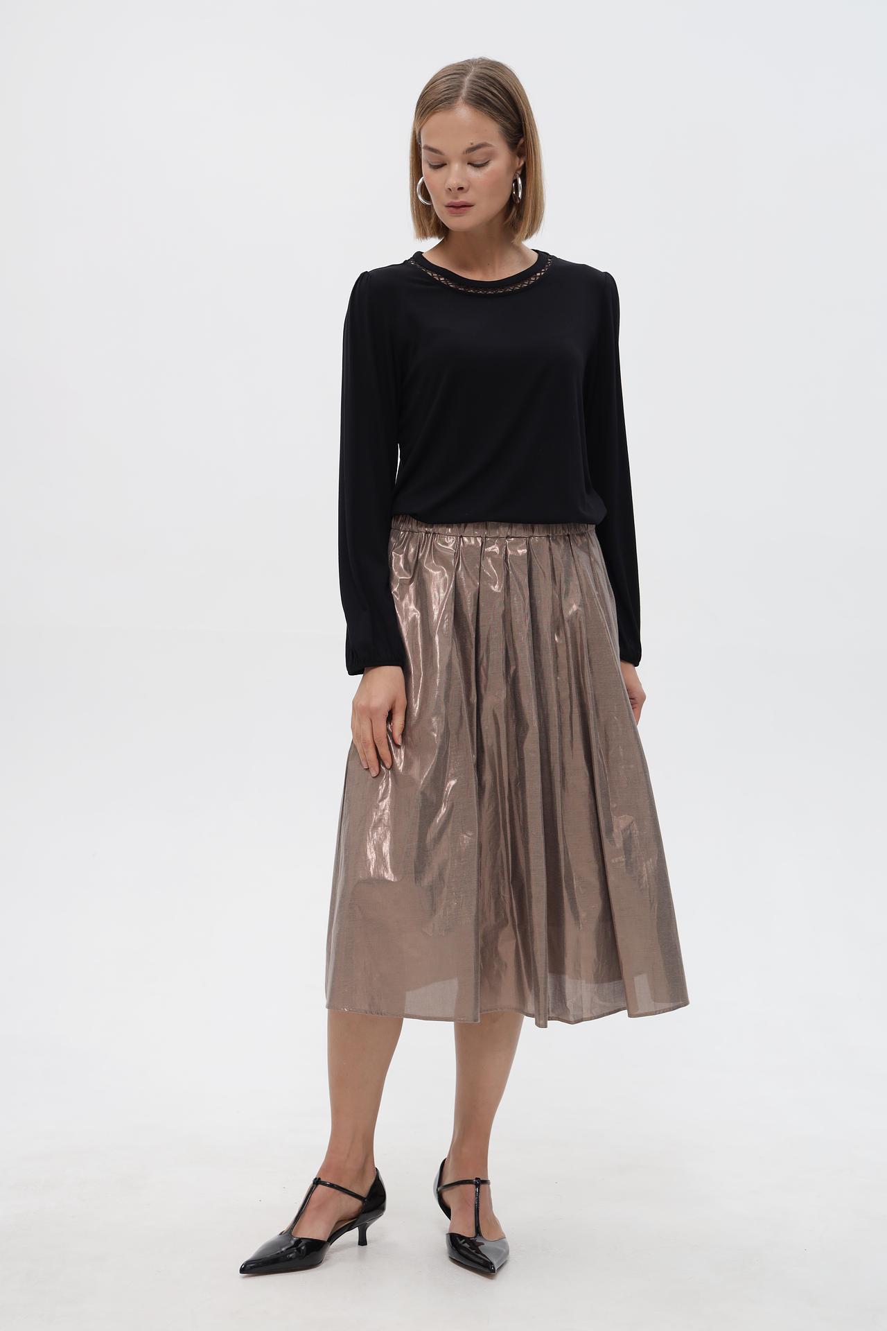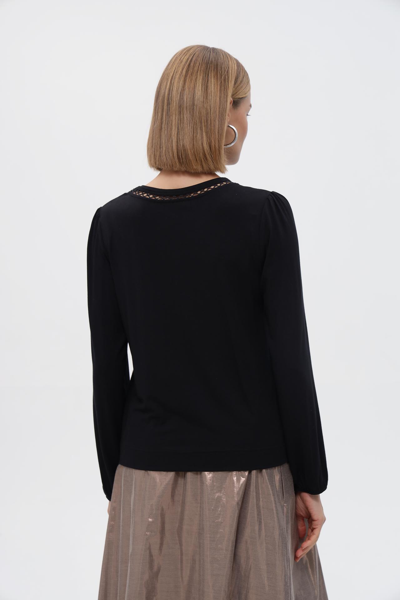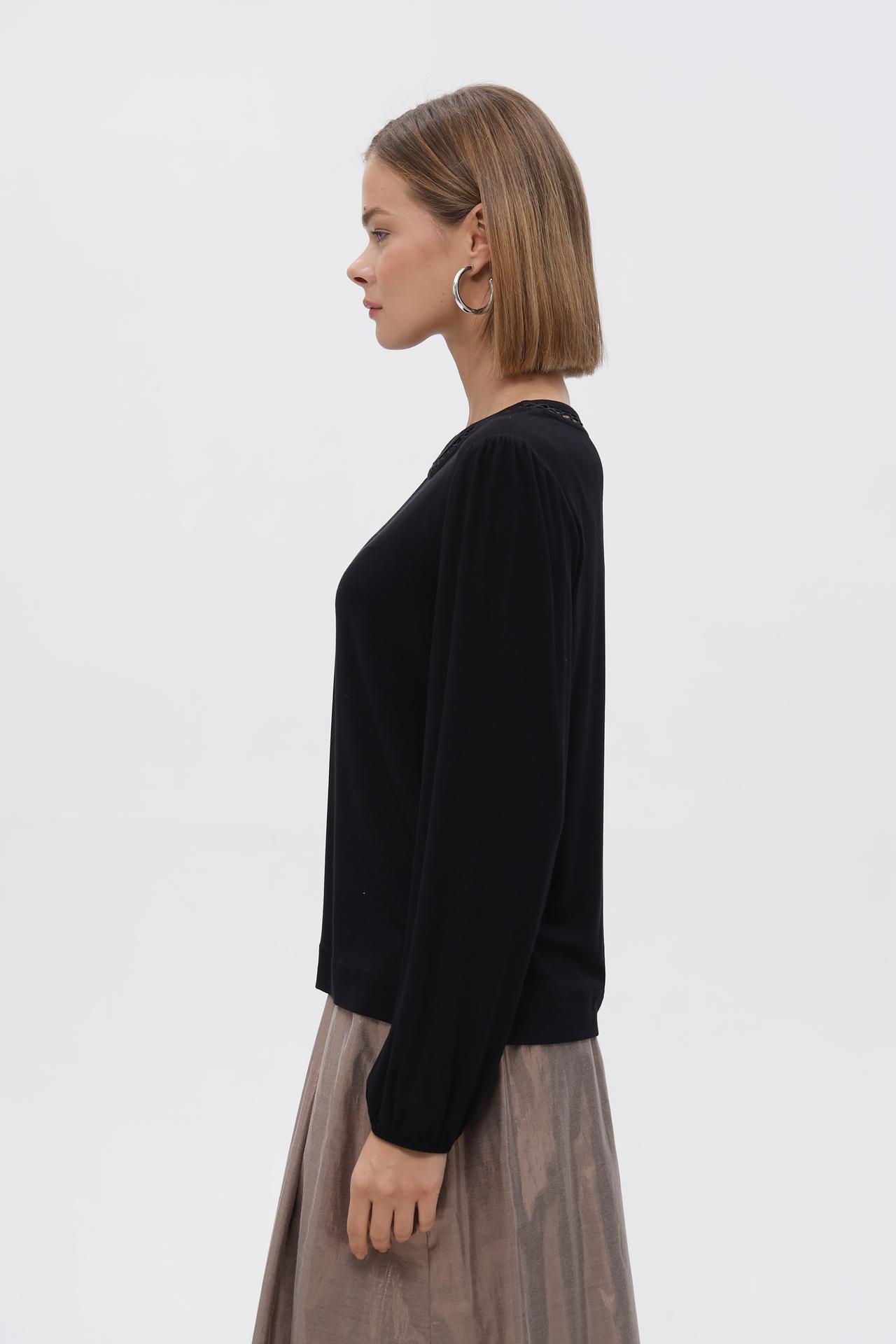 - Дизайн: Классический круглый вырез горловины украшен деликатной декоративной вставкой, выполненной в виде плетения. Длинные рукава с манжетами добавляют образу элегантности.