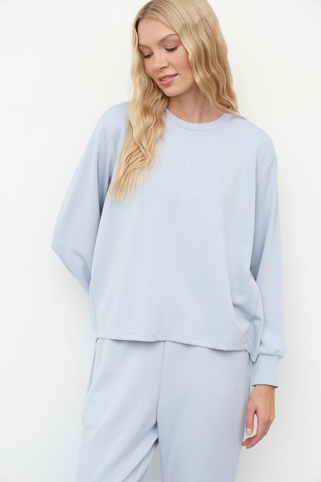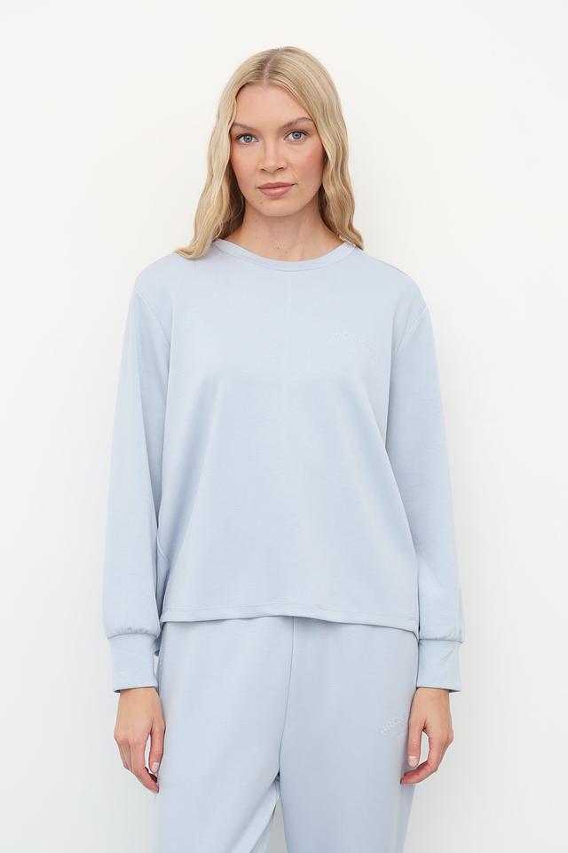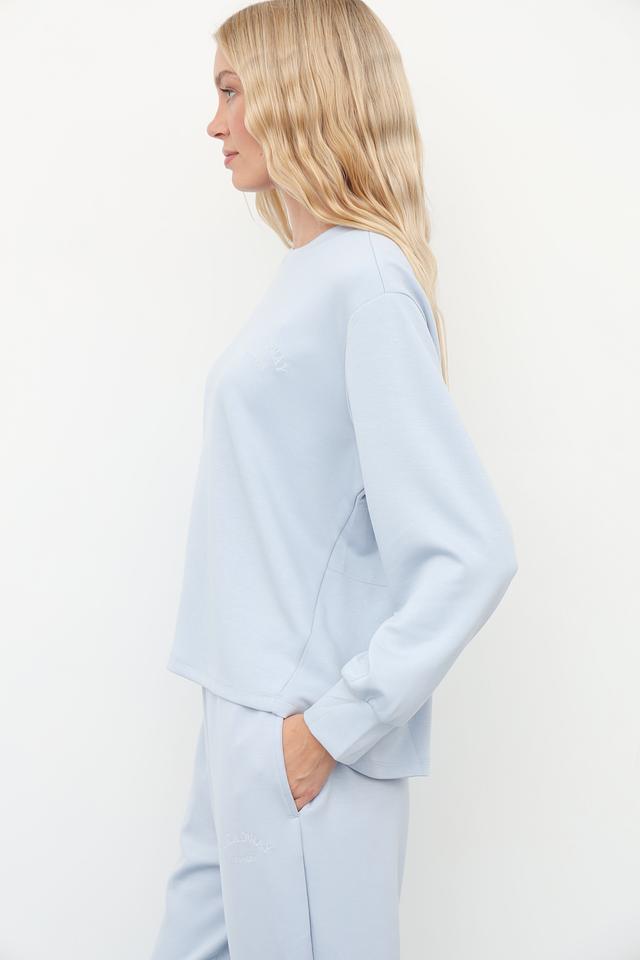 Голубой пуловер от Broadway выполнен из мягкой смеси полиэстера, вискозы и эластана. Модель имеет округлый вырез горловины и длинные рукава с манжетами. Декорирован вышитым логотипом бренда. Состав: полиэстер 50%, вискоза 45%, эластан 5%