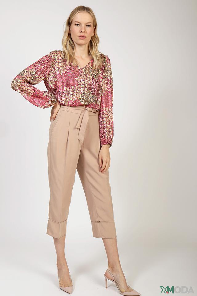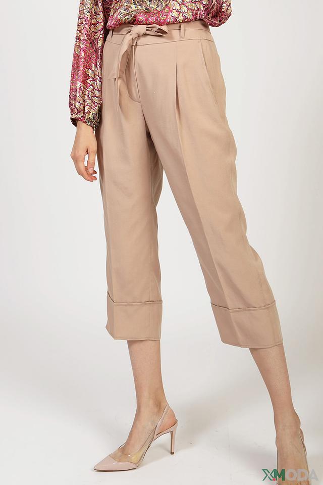 Брюки имеют прямой крой и укороченную длину, что делает их идеальным выбором для теплого времени года. Высокая посадка подчеркивает талию и создает женственный силуэт. Модель дополнена поясом с завязками, который позволяет регулировать посадку и добавляет образу акцент.
