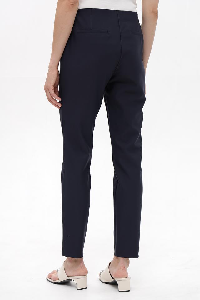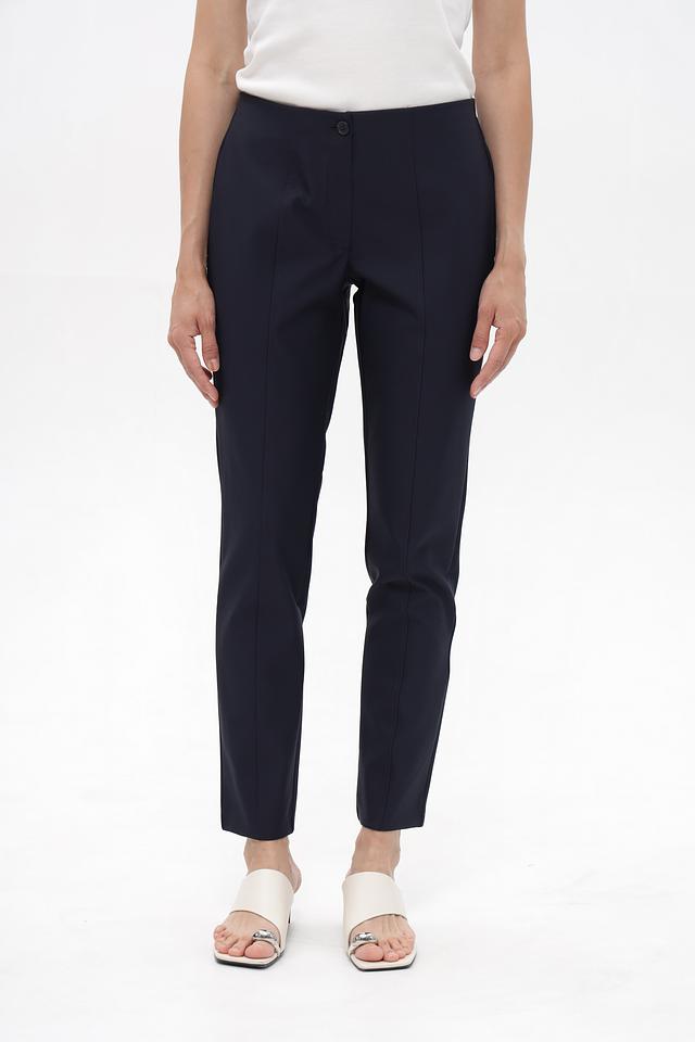 Брюки имеют узкий крой и слегка зауженный силуэт, подчеркивающий фигуру. Пояс на пуговице и аккуратные стрелки придают им элегантный и лаконичный вид.