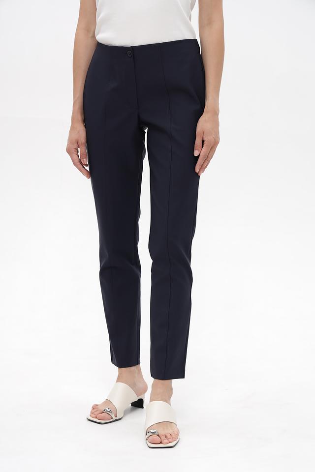 Женские брюки Betty Barclay классического темно-синего цвета, узкого кроя. Изготовлены из полиамида с добавлением эластана, обеспечивающего комфорт и свободу движений. Идеальный выбор для создания делового и повседневного образа. Состав: полиамид 88%, эластан 12%