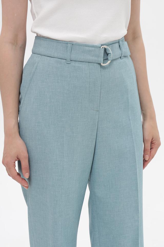 Брюки имеют прямой крой и завышенную талию, что визуально удлиняет ноги и подчеркивает достоинства фигуры. Широкий пояс с металлической пряжкой акцентирует талию и добавляет образу изысканности.