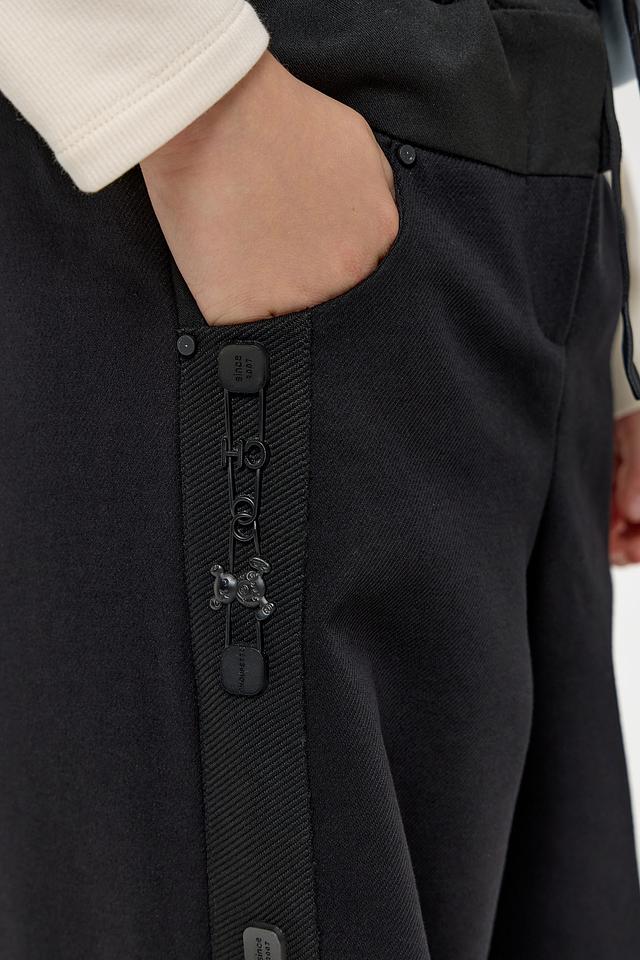 Брюки имеют широкий крой, обеспечивающий свободу движений, что особенно важно для активных детей. Эластичный пояс дополнен шнурком, позволяющим регулировать посадку по фигуре.