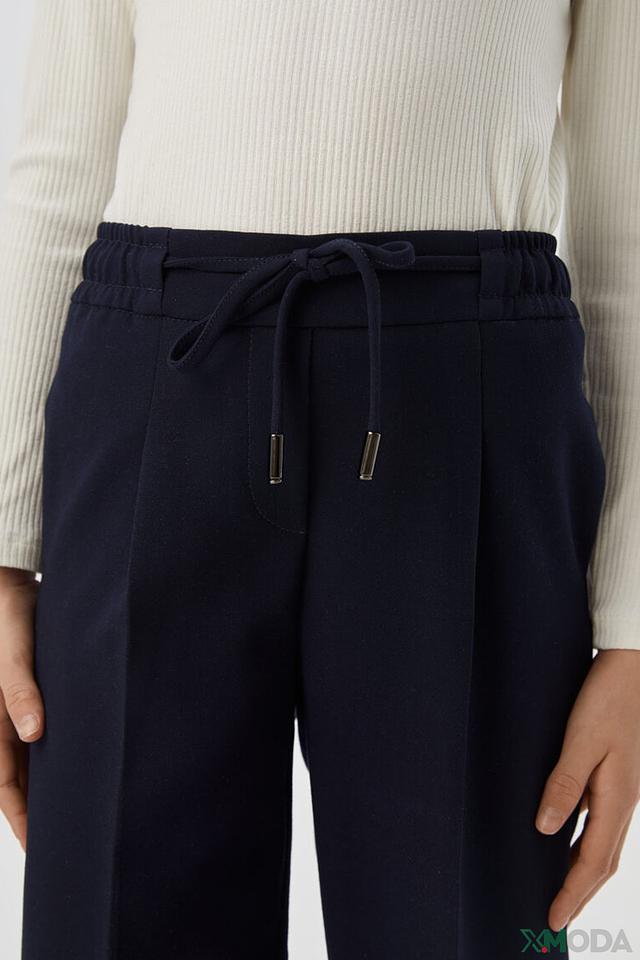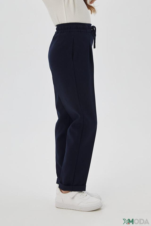 Брюки имеют удобный эластичный пояс с регулирующими шнурками, обеспечивающими идеальную посадку. Манжеты внизу брюк добавляют образу аккуратности и стиля.