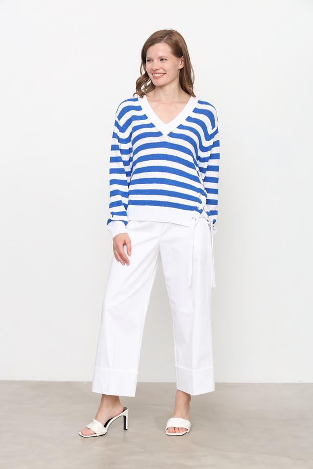 Брюки имеют прямой крой и завышенную талию, что визуально удлиняет ноги и подчеркивает фигуру. Эластичный пояс обеспечивает комфортную посадку и свободу движений. Широкие штанины в стиле палаццо добавляют образу элегантности и изысканности.