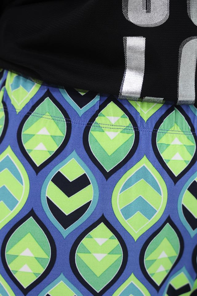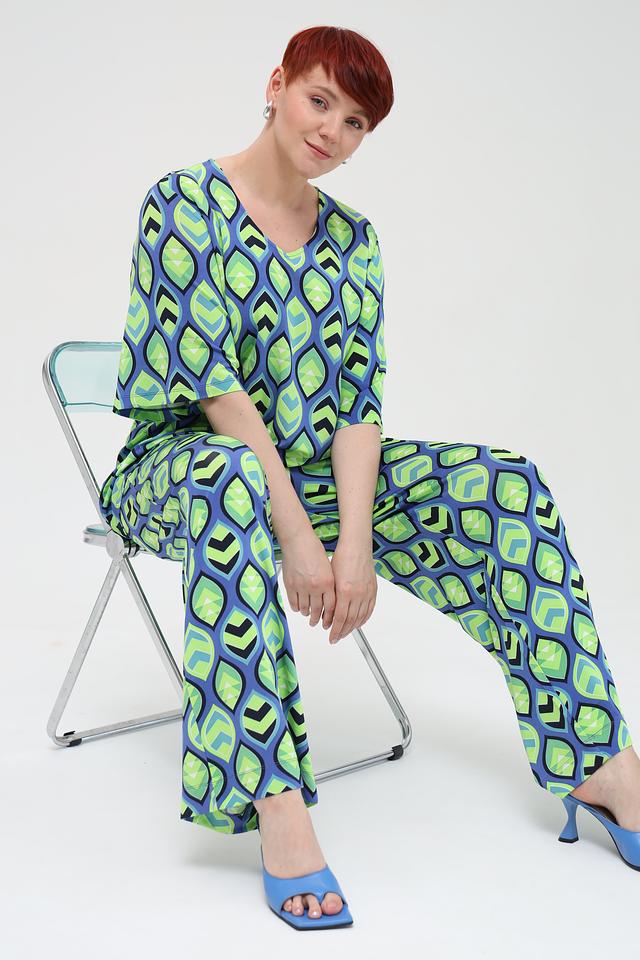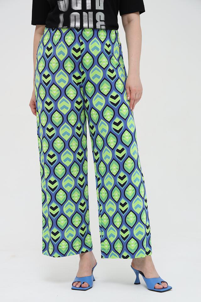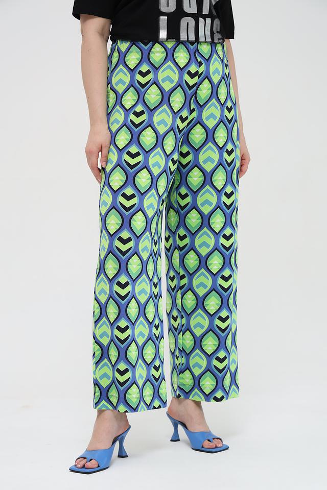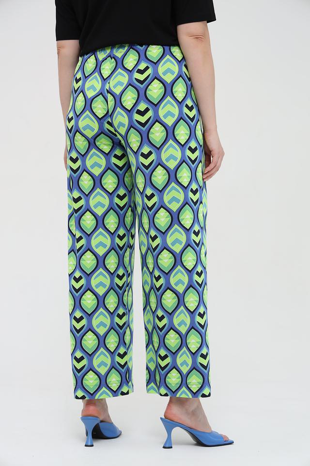 Брюки отличаются оригинальным геометрическим принтом в сине-зелёной гамме, который придаёт им неповторимый стиль. Прямой крой и широкие штанины делают их универсальными и подходящими для различных типов фигуры.