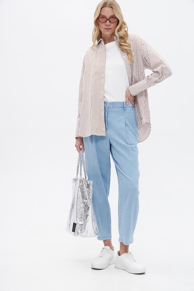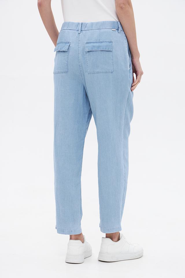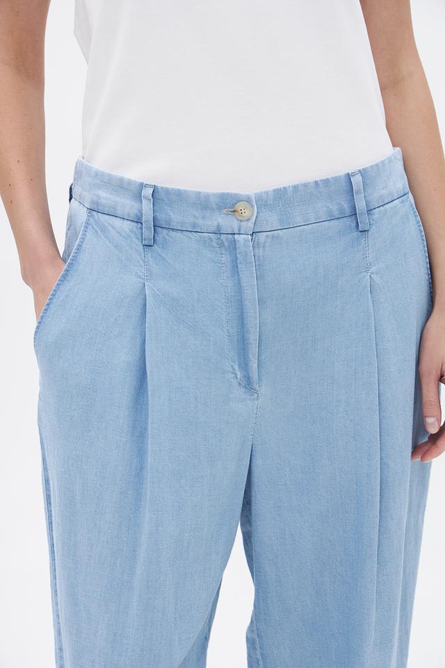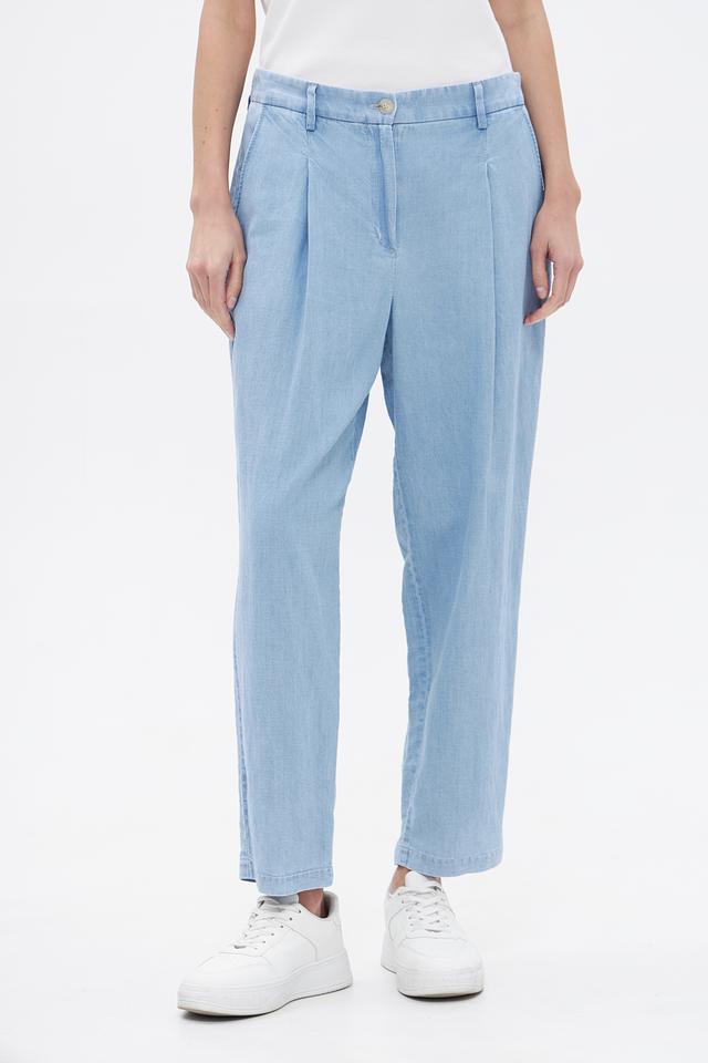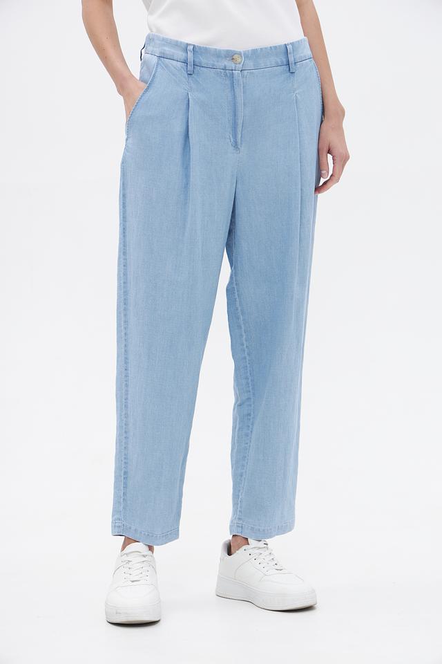 Женские брюки Gardeur нежного голубого оттенка с удобной посадкой и стильными защипами. Модель выполнена из смесового состава с хлопком, льном и луоселлом, обеспечивающим комфорт и воздухопроницаемость. Состав: хлопок 50%, лен 25%, луоселл 25%