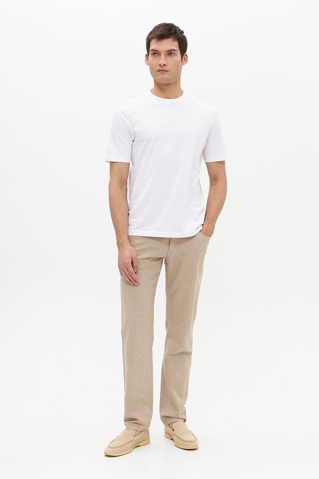 Брюки имеют классическую посадку, пять карманов и застежку на молнию с пуговицей. Текстура ткани добавляет брюкам изысканности и делает их отличным выбором для создания стильного и элегантного образа. Идеально подойдут для тёплой погоды.