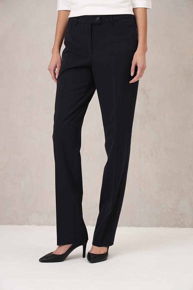 Застежка на пуговицу и молнию обеспечивает надежную фиксацию. Брюки идеально подойдут для создания деловых образов в сочетании с блузками и жакетами, а также для повседневной носки с трикотажем и топами. Состав ткани: 54% полиэстер, 41% шерсть, 5% эластан.