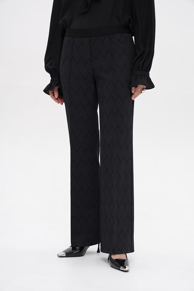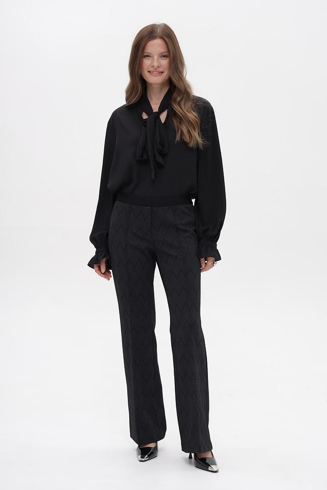 Брюки имеют классический крой с прямыми штанинами и завышенной талией. Они изготовлены из высококачественного полиамида с добавлением эластана (2%), что обеспечивает комфортную посадку и свободу движений.