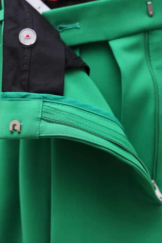 Брюки имеют классическую посадку на талии и застежку на молнию с пуговицей. Спереди расположены аккуратные складки, добавляющие изысканности образу. Изготовлены из высококачественного материала, состоящего из 64% полиэстера, 31% вискозы и 5% эластана, что обеспечивает комфорт в носке и устойчивость к сминанию.