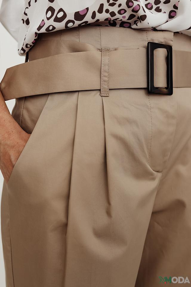 Особенностью модели является широкий пояс с элегантной пряжкой, который подчеркивает талию и добавляет образу изысканности. Застежка на пуговицы обеспечивает надежную фиксацию. Брюки имеют аккуратные складки спереди и манжеты по низу, которые придают им завершенный вид.