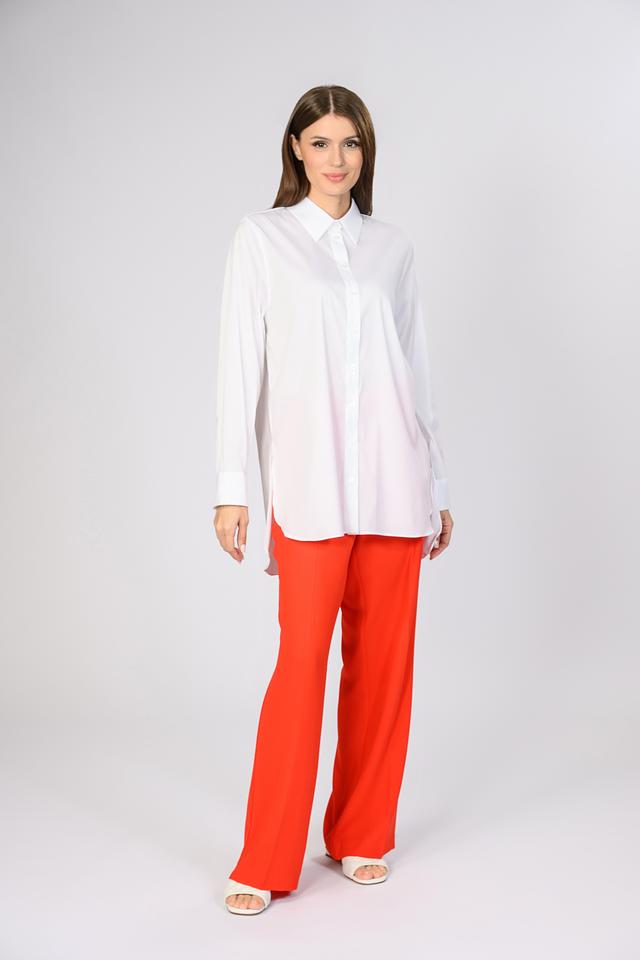 Брюки имеют прямой крой и завышенную талию, что визуально удлиняет ноги и создает элегантный силуэт. Классическая посадка обеспечивает комфорт в носке, а гладкая ткань на основе 100% полиэстера придает изделию благородный вид.