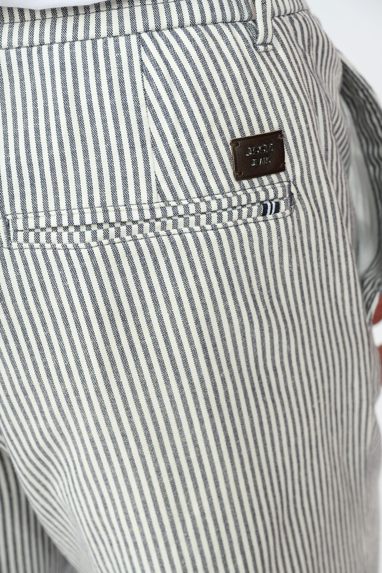 Актуальный дизайн с принтом в полоску и удобный пояс на завязках делают эти брюки универсальным дополнением к вашему гардеробу. Сочетайте их с футболками, поло или легкими рубашками для создания непринужденных повседневных ансамблей.