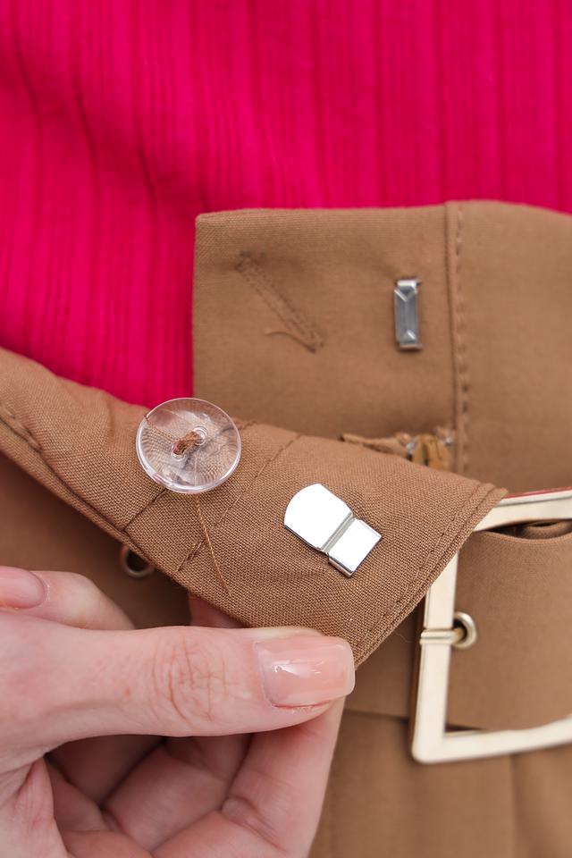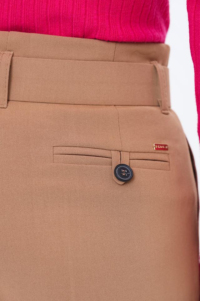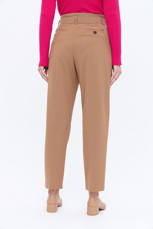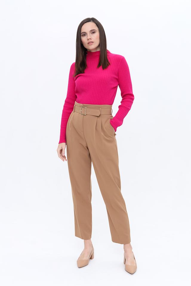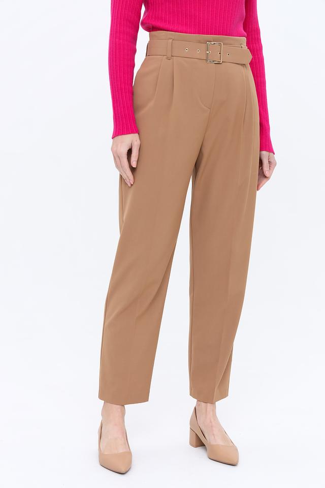 Брюки имеют высокую посадку и пояс с пряжкой, который подчеркивает талию и создает женственный силуэт. Спереди брюки оформлены защипами, что придает им более изысканный вид. Застежка – молния и пуговица.