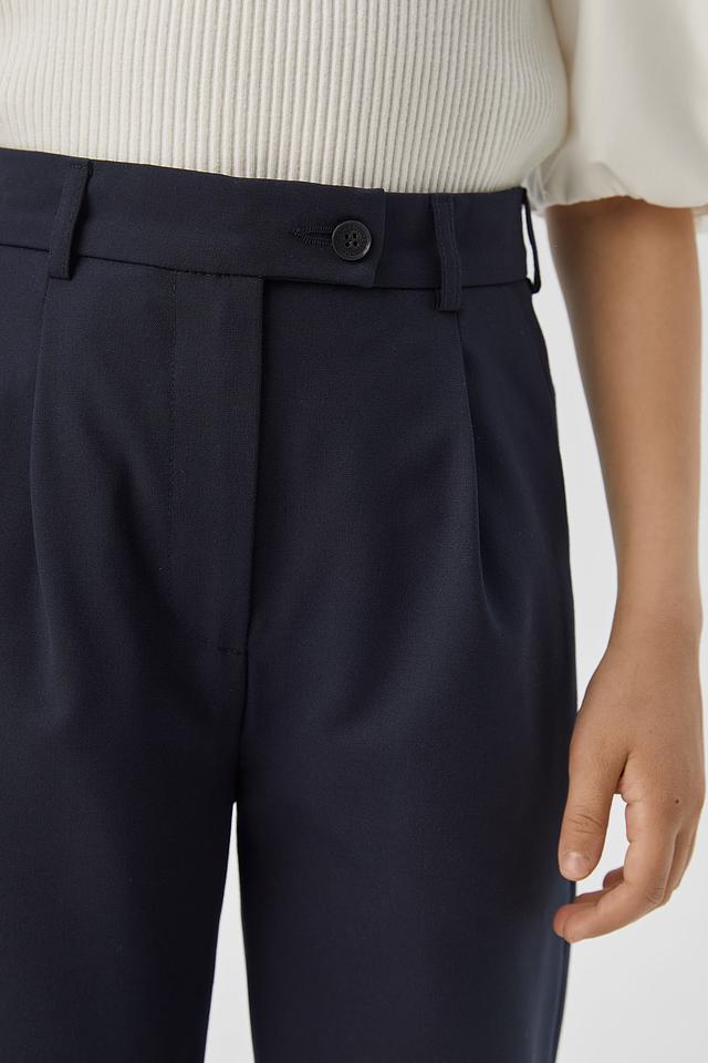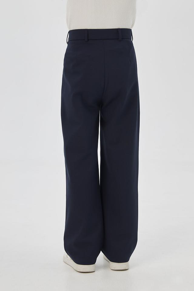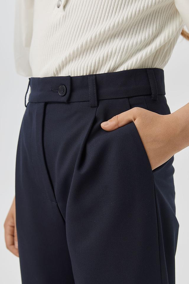 Брюки имеют прямой крой и широкие штанины, обеспечивающие свободу движений и комфорт в течение всего дня. Модель дополнена аккуратными складками спереди, что придает ей более элегантный вид. Застежка на пуговицу и молнию обеспечивает надежную фиксацию.