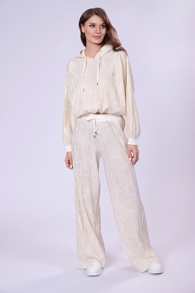 Брюки имеют прямой крой и широкие штанины, что обеспечивает свободу движений и комфорт в течение всего дня. Эластичный пояс с кулиской позволяет регулировать посадку по фигуре.