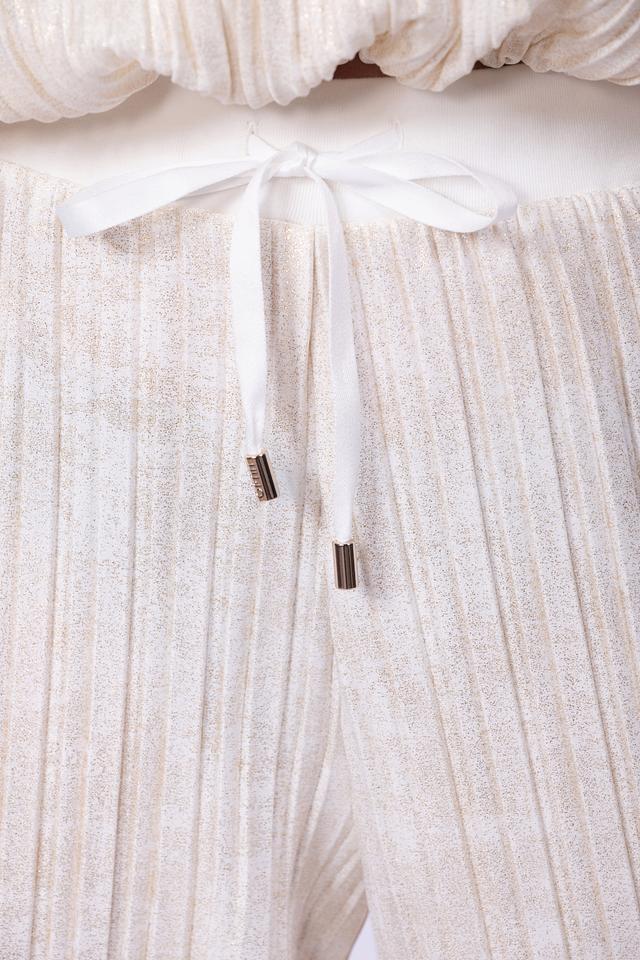 Бежевые брюки от Liu-Jo с вертикальным плиссированным узором и эластичным поясом на завязках. Модель выполнена из полиэстера с добавлением эластана, обеспечивающего комфорт при носке. Состав: полиэстер 97%, эластан 3%