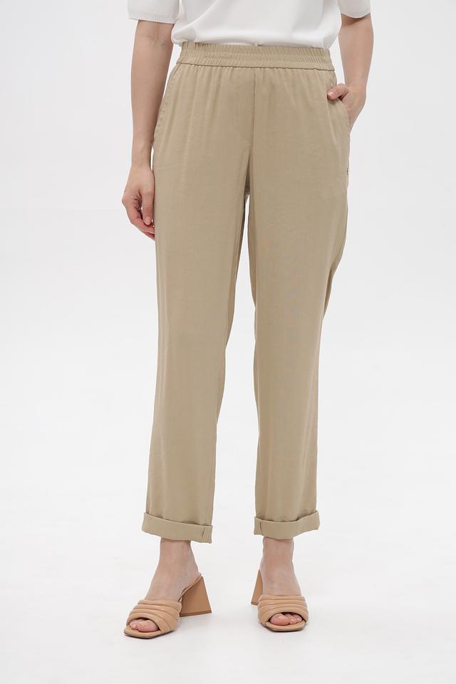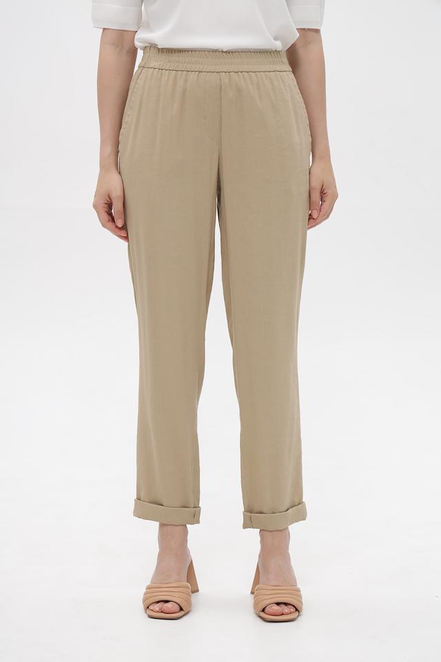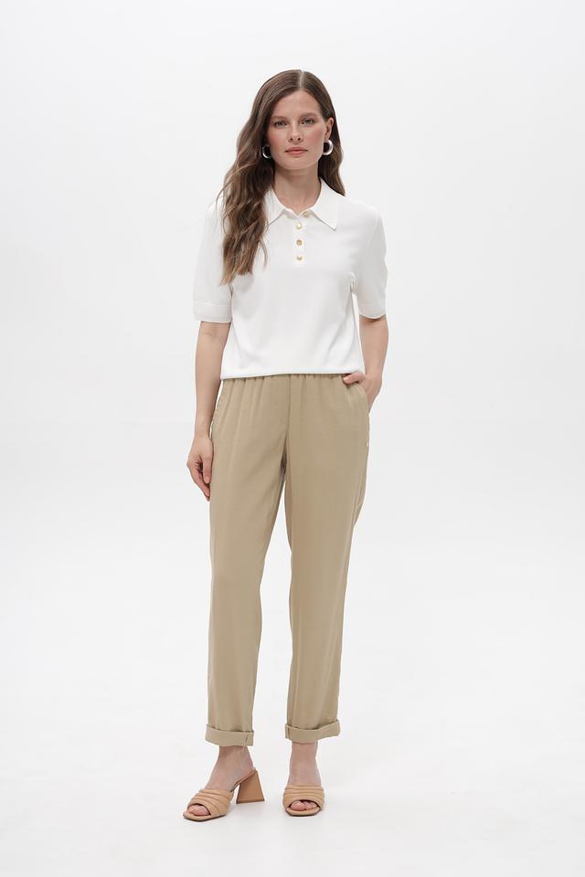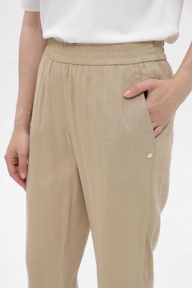 Брюки изготовлены из смесовой ткани, сочетающей в себе натуральный лен (62%), мягкую вискозу (35%) и эластан (3%). Это обеспечивает комфорт в носке, хорошую воздухопроницаемость и небольшую степень эластичности.