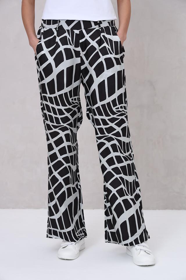 Особенностью модели является яркий геометрический принт в чёрно-белой гамме, который придаёт брюкам современный и стильный вид. Прямой крой и эластичный пояс на талии обеспечивают удобную посадку по фигуре.