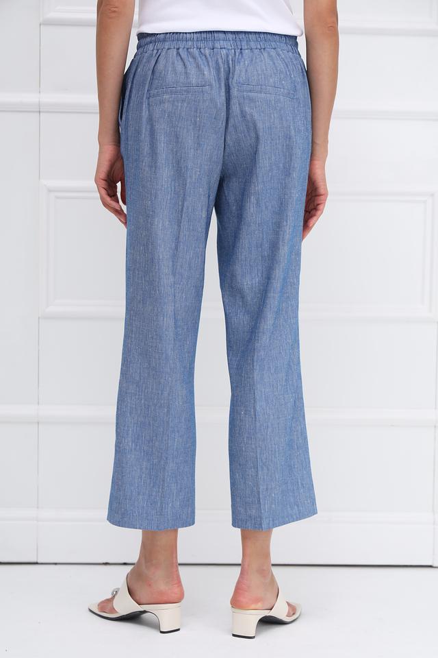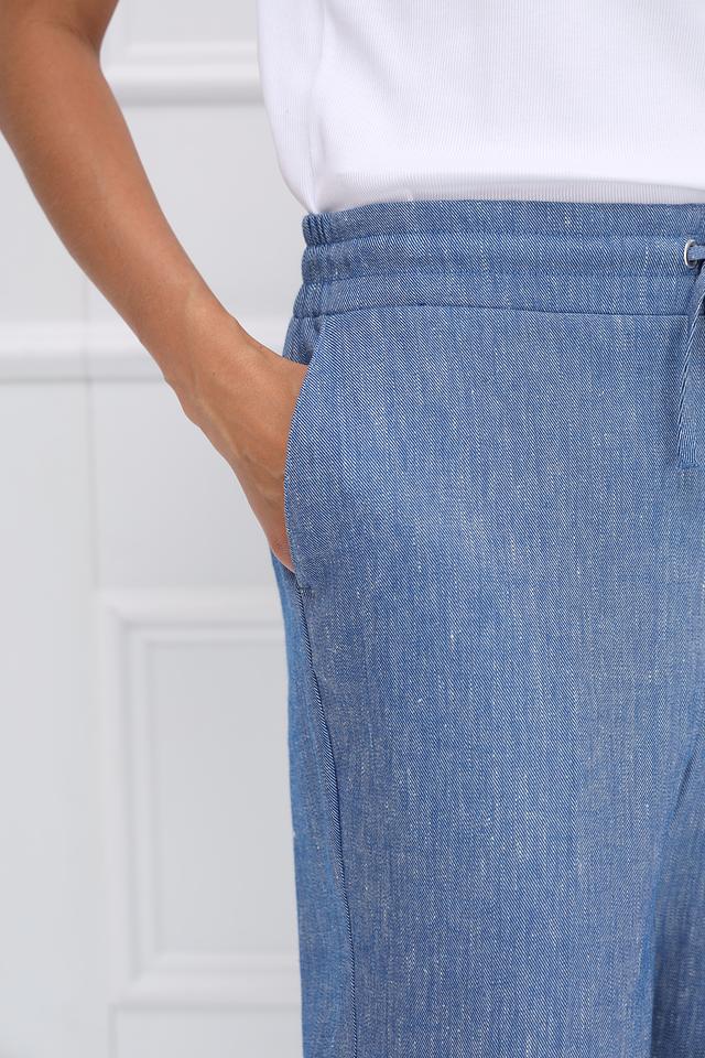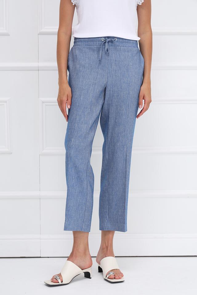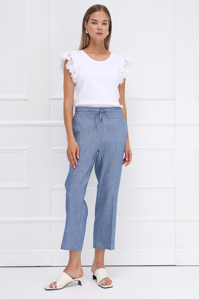 Брюки имеют прямой, слегка укороченный силуэт, который подчеркивает стройность ног. Эластичный пояс с завязками обеспечивает удобную посадку и позволяет регулировать облегание. Классический голубой цвет легко сочетается с различными элементами одежды, создавая разнообразные образы.