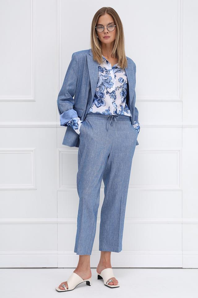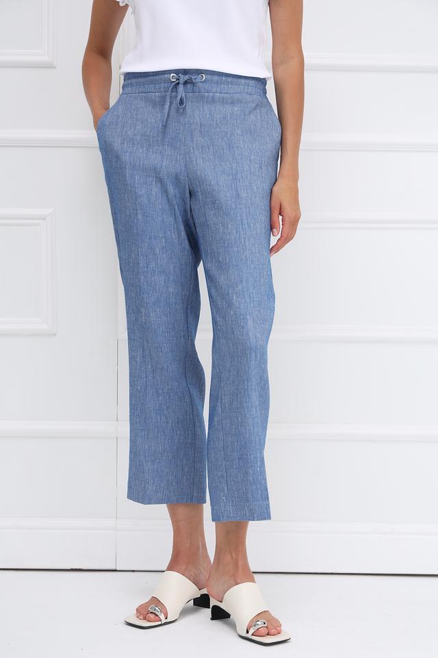 Женские брюки Monari голубого цвета выполнены из льна с добавлением полиэстера и вискозы. Модель с завязками на талии и укороченным прямым силуэтом. Состав: лен 52%, полиэстер 30%, вискоза 16%, эластан 2%