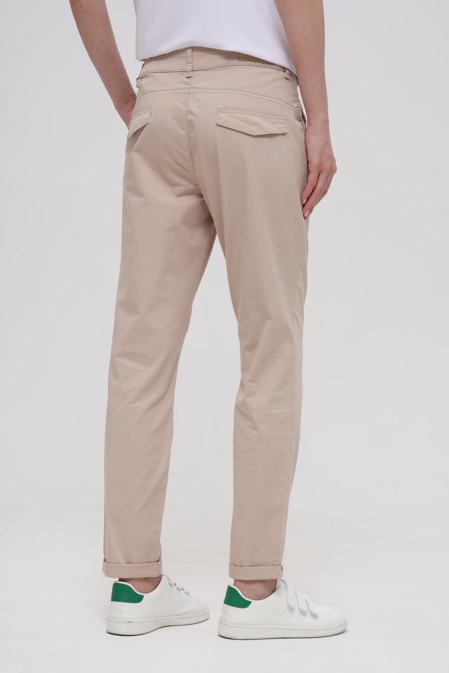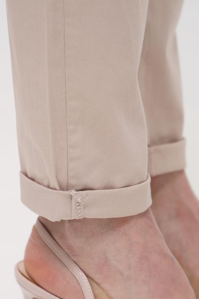 Брюки имеют слегка завышенную талию и небольшие складки спереди, что придает им более элегантный вид. Ширина штанин умеренная, а низ брюк можно слегка подворачивать, создавая более расслабленный образ.