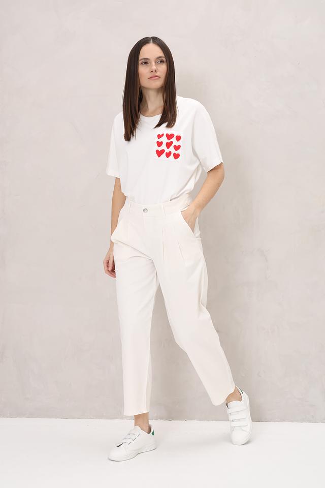 Брюки имеют прямой крой и высокую посадку, что обеспечивает комфортную посадку по фигуре и визуально удлиняет ноги. Спереди брюки украшены аккуратными складками, добавляющими им элегантности.