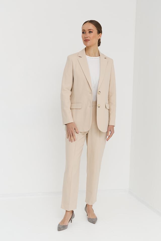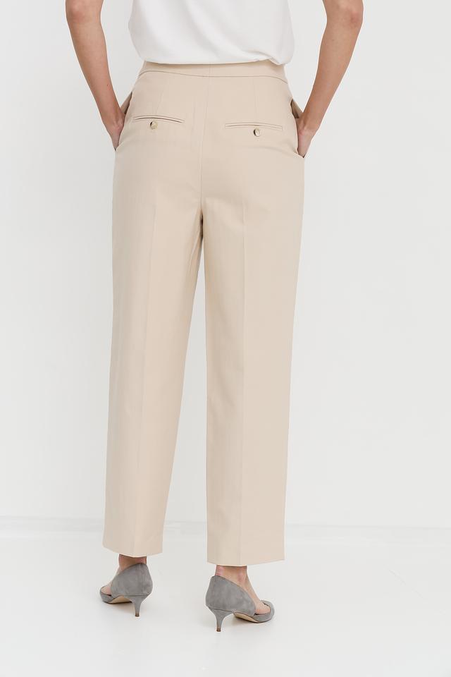 Брюки имеют прямой крой, пояс на застежку и аккуратные складки спереди, что придает им более формальный вид. Задние карманы оформлены с небольшими деталями. Состав ткани включает 69% хлопок, 29% лен и 2% эластан, благодаря чему брюки приятны к телу, хорошо держат форму и обеспечивают комфорт в носке.