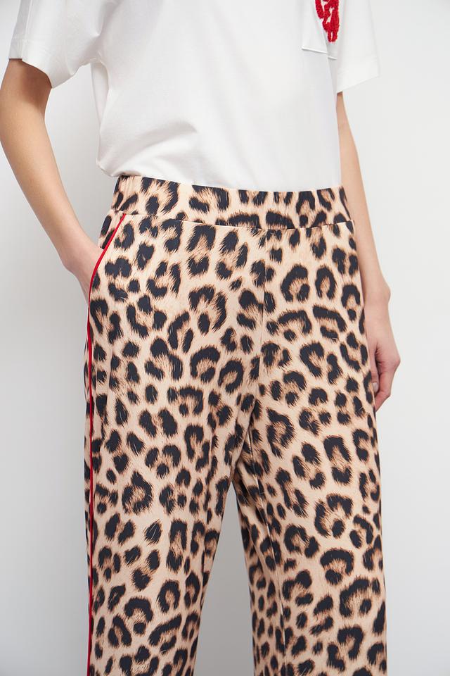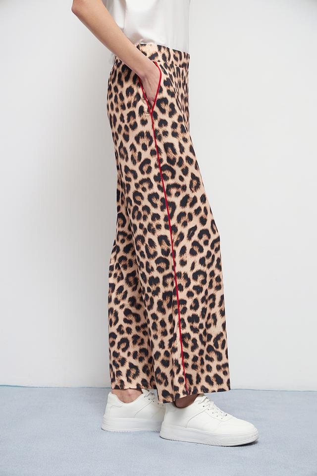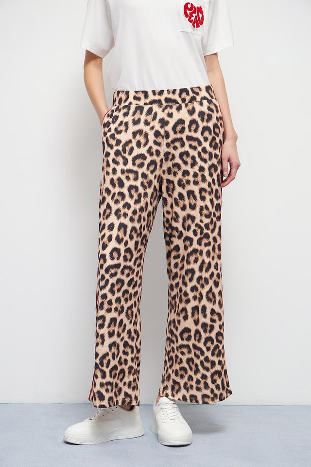 Женские брюки клёш от Oui в леопардовый принт с красной полосой по бокам. Модель выполнена из мягкой ткани с добавлением эластана для комфортной посадки и свободы движений. Состав: полиэстер 92%, эластан 8%