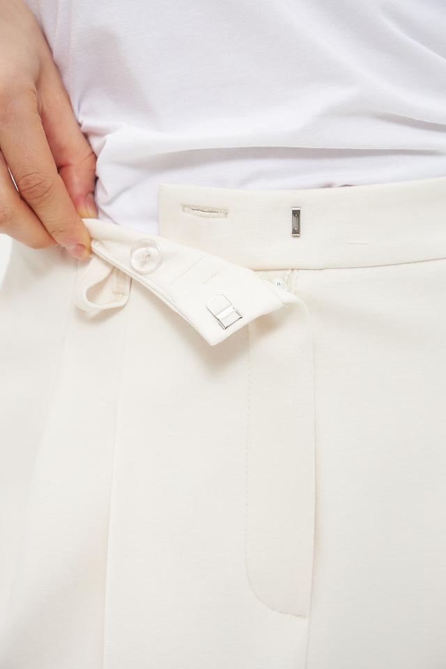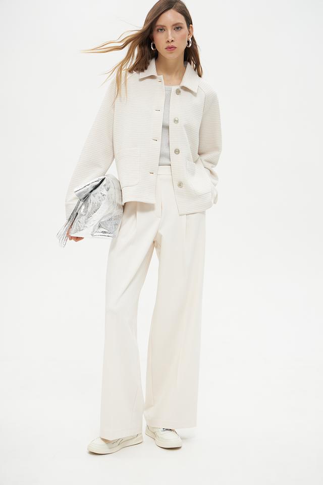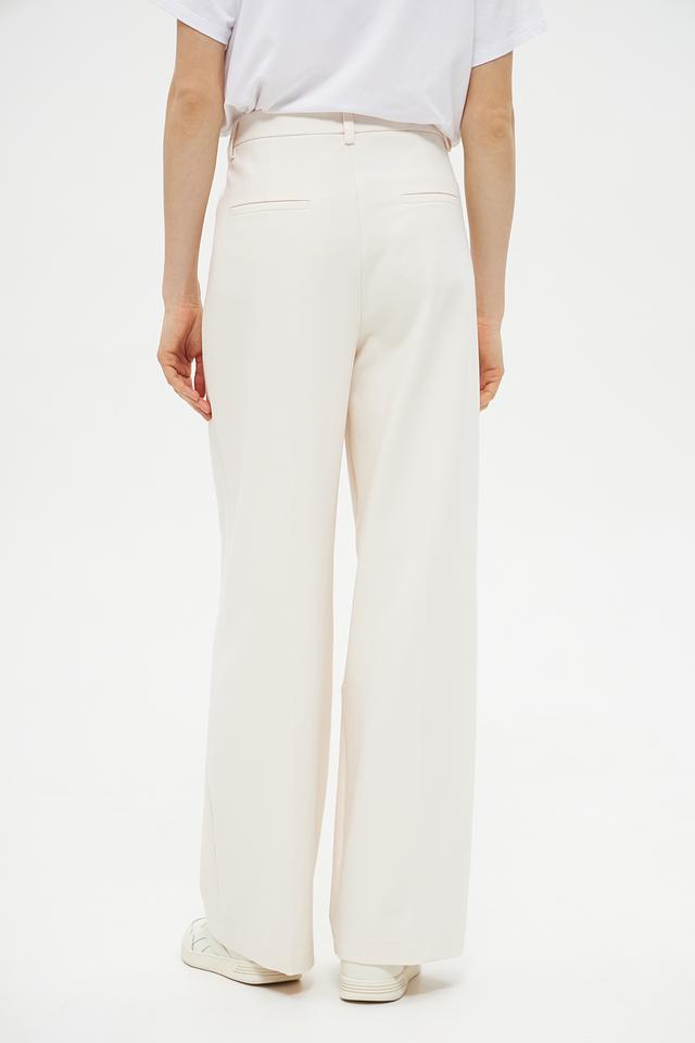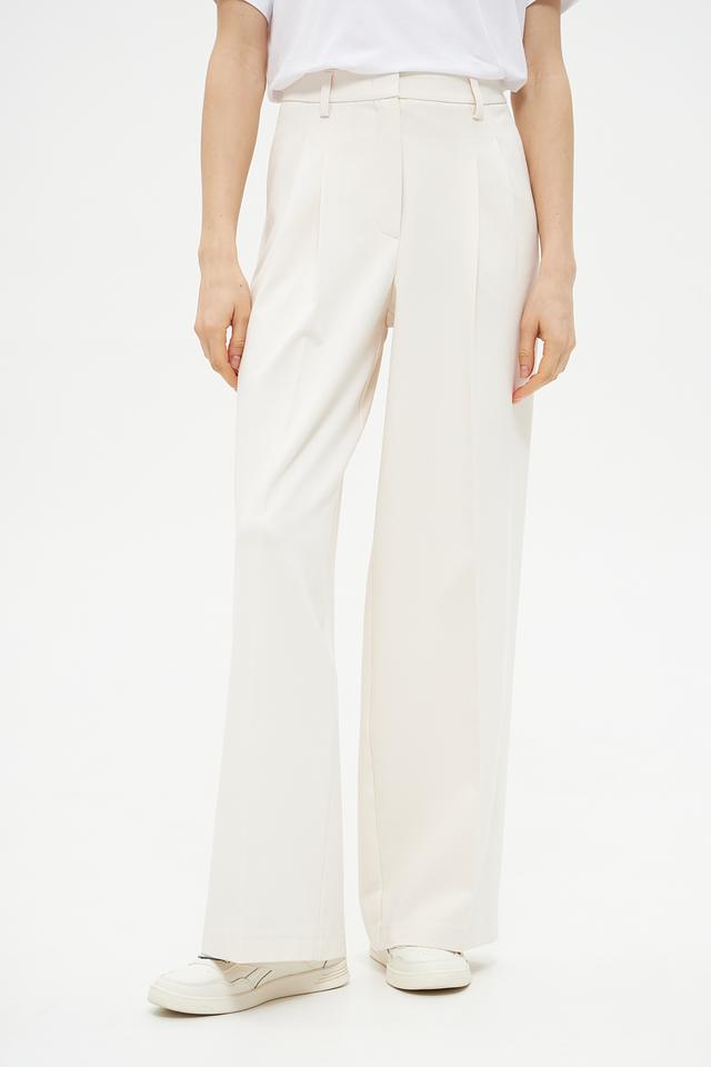 Брюки имеют прямой крой, высокую посадку и широкие штанины, что обеспечивает свободу движений и комфорт в течение всего дня. Классический дизайн дополнен аккуратными складками спереди, которые придают брюкам более изысканный вид.
