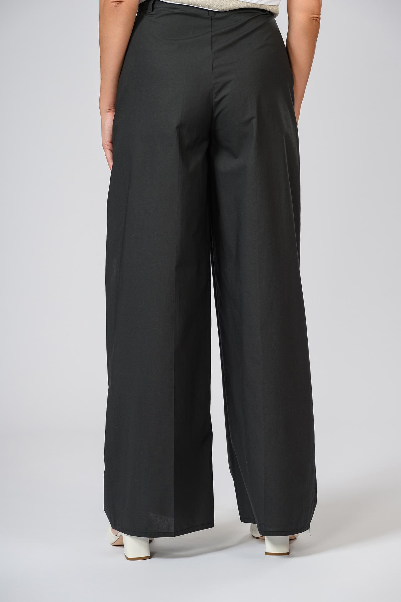 - Крой: Широкие брюки с высокой посадкой. Такой фасон визуально удлиняет ноги и создает женственный силуэт, обеспечивая свободу движений.