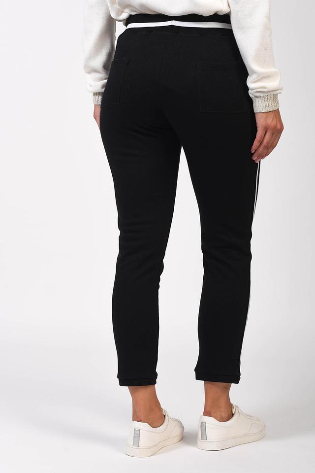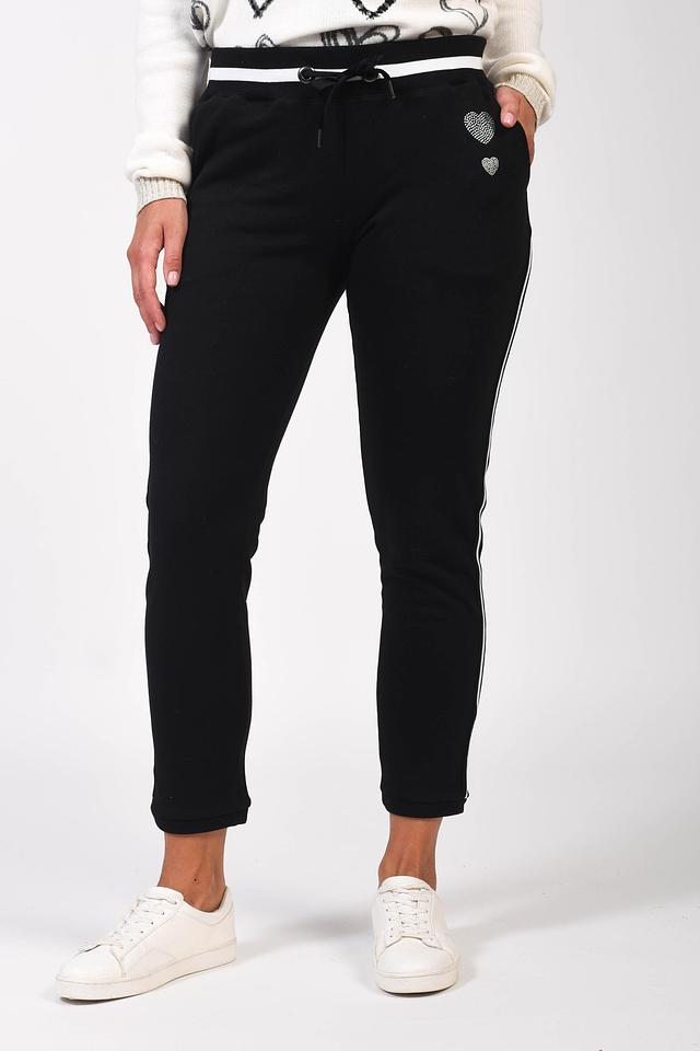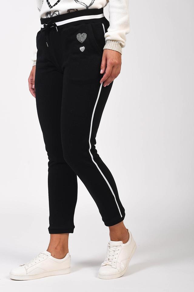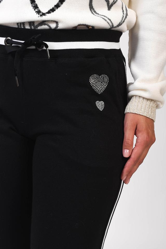 Брюки выполнены в классическом чёрном цвете и имеют прямой, слегка зауженный к низу крой. На боковой части брюк расположена контрастная белая полоска, добавляющая динамики образу. Декоративные элементы в виде небольших сердечек, украшенных стразами, придают брюкам изысканность.