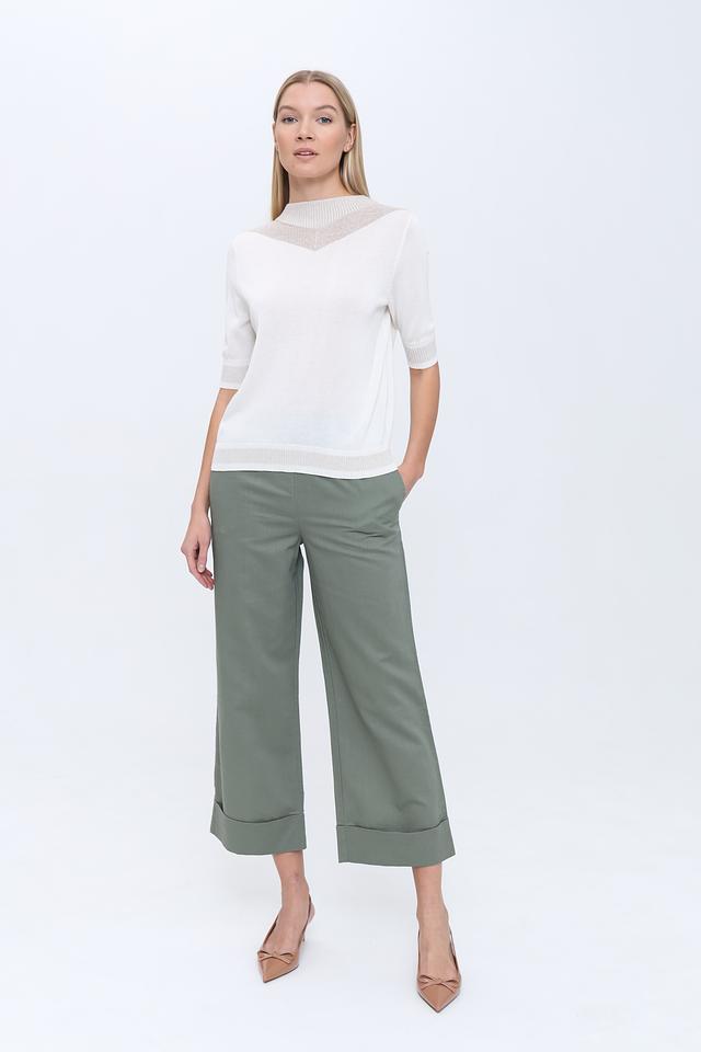 Брюки имеют кюлотный крой, который визуально удлиняет ноги и создает элегантный силуэт. Эластичный пояс обеспечивает комфортную посадку по фигуре, а манжеты внизу добавляют образу непринужденности.