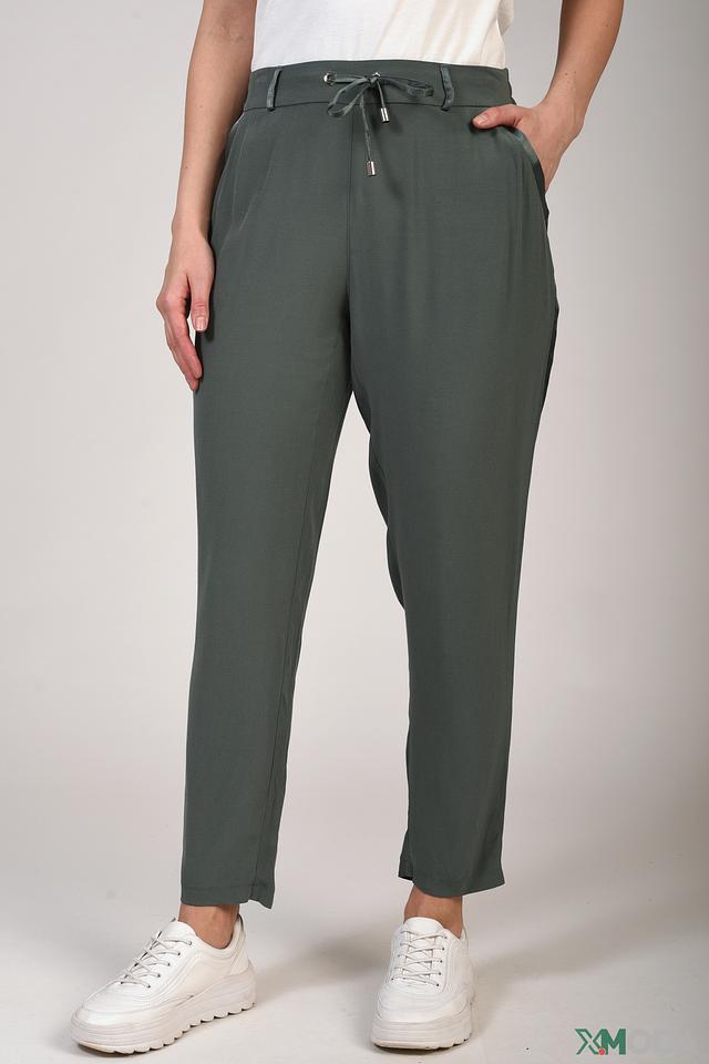 Модель имеет прямой крой, пояс на резинке с завязками и боковые карманы. Зауженный книзу силуэт визуально удлиняет ноги и делает образ более элегантным. Цвет хаки универсален и легко сочетается с различными элементами одежды.