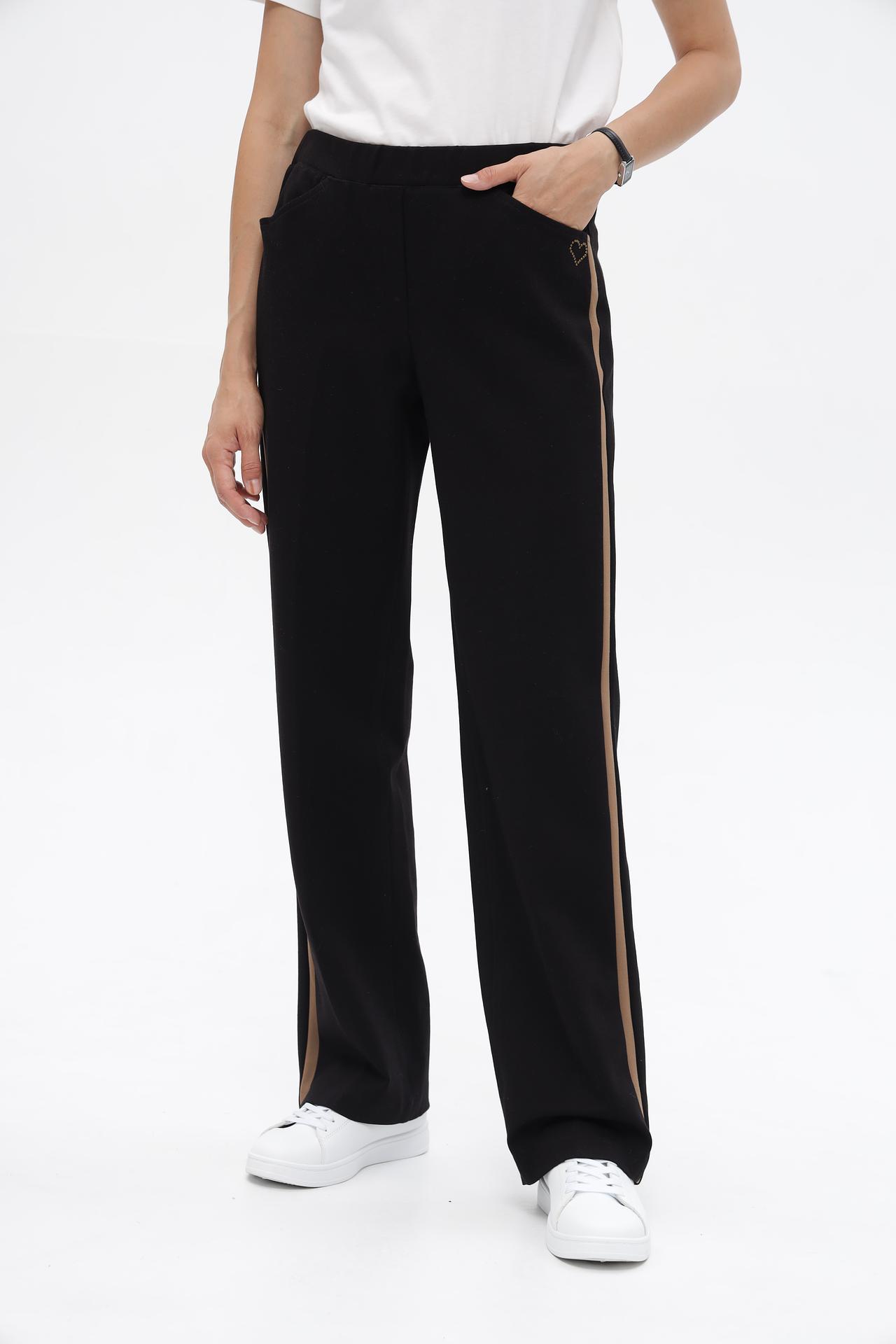 - Элегантный дизайн: Прямой крой и лаконичные детали делают брюки универсальными. Контрастная лампаса и миниатюрная вышивка сердца придают модели современный и утонченный вид.
