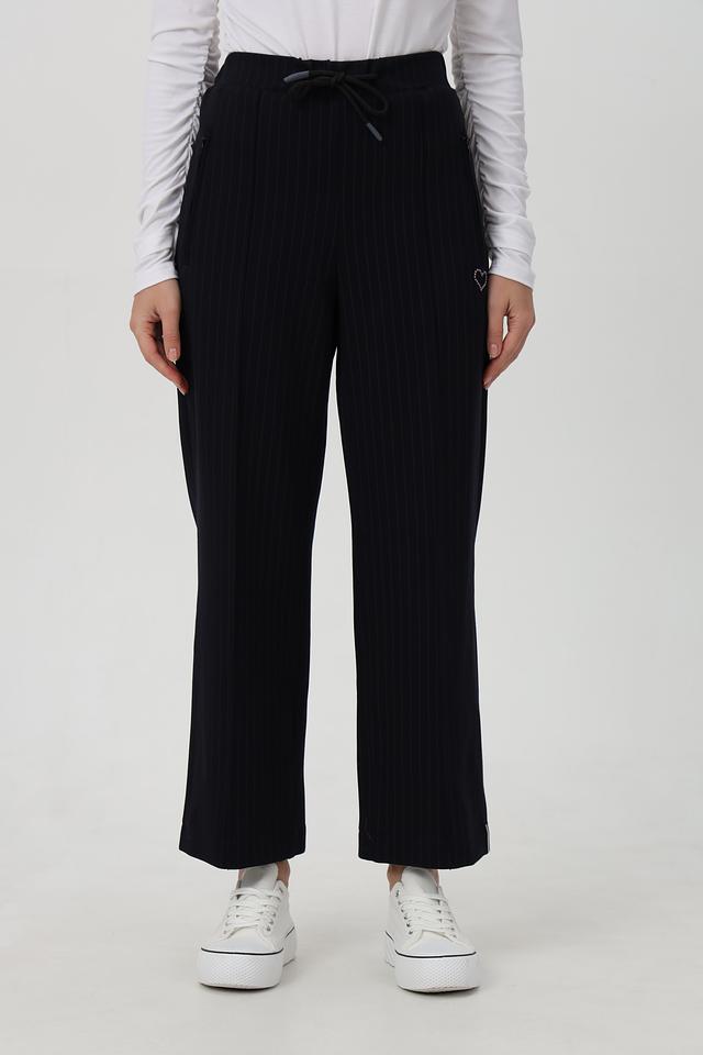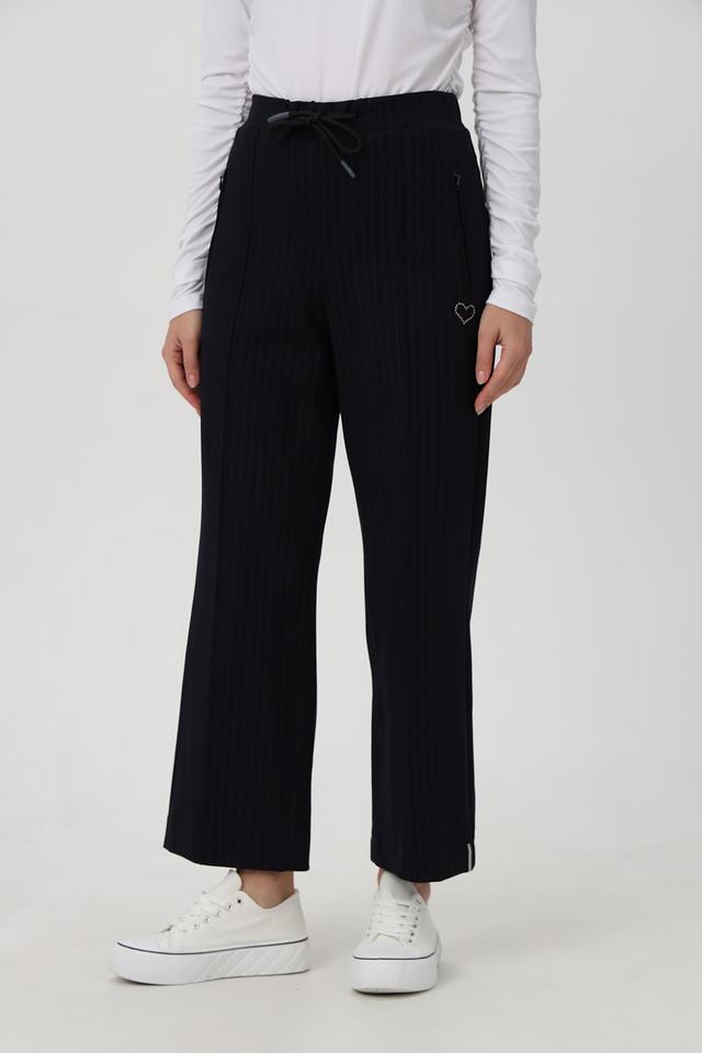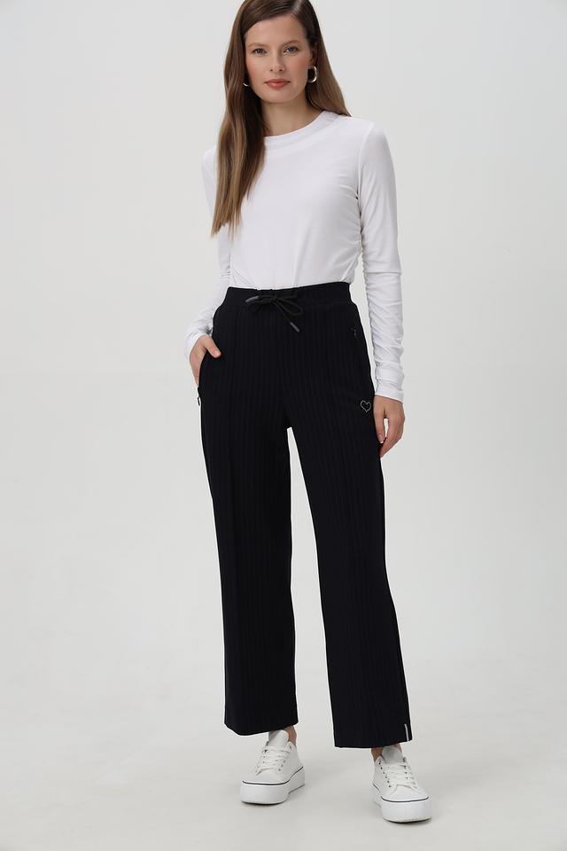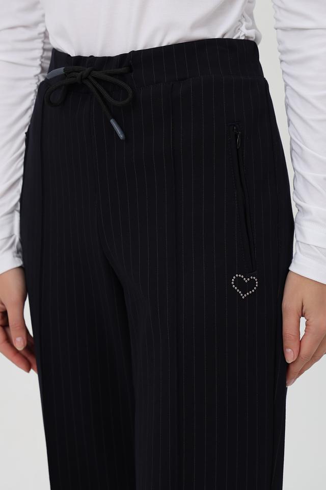 Брюки имеют высокую посадку и эластичный пояс, дополненный шнурком для регулировки. По бокам расположены прорезные карманы. Сбоку брюк присутствует декоративное сердце, выполненное из страз.